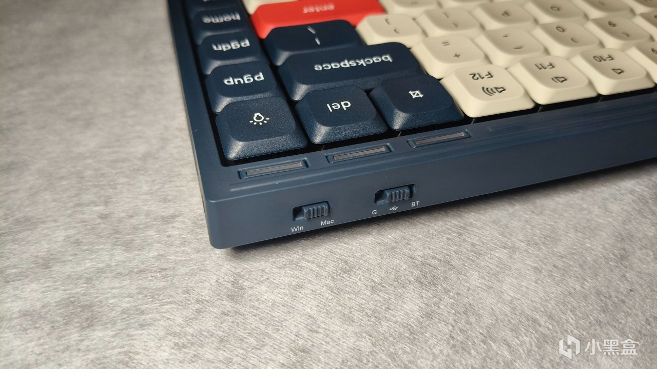 連接撥杆和模式切換撥杆放在了右上端,同時將鍵盤指示燈放在了撥杆上方部分,既讓指示燈處於一個並不突兀的地方同時還能和左側的金屬銘牌呼應,對稱美學這塊算是被skn拿捏了。