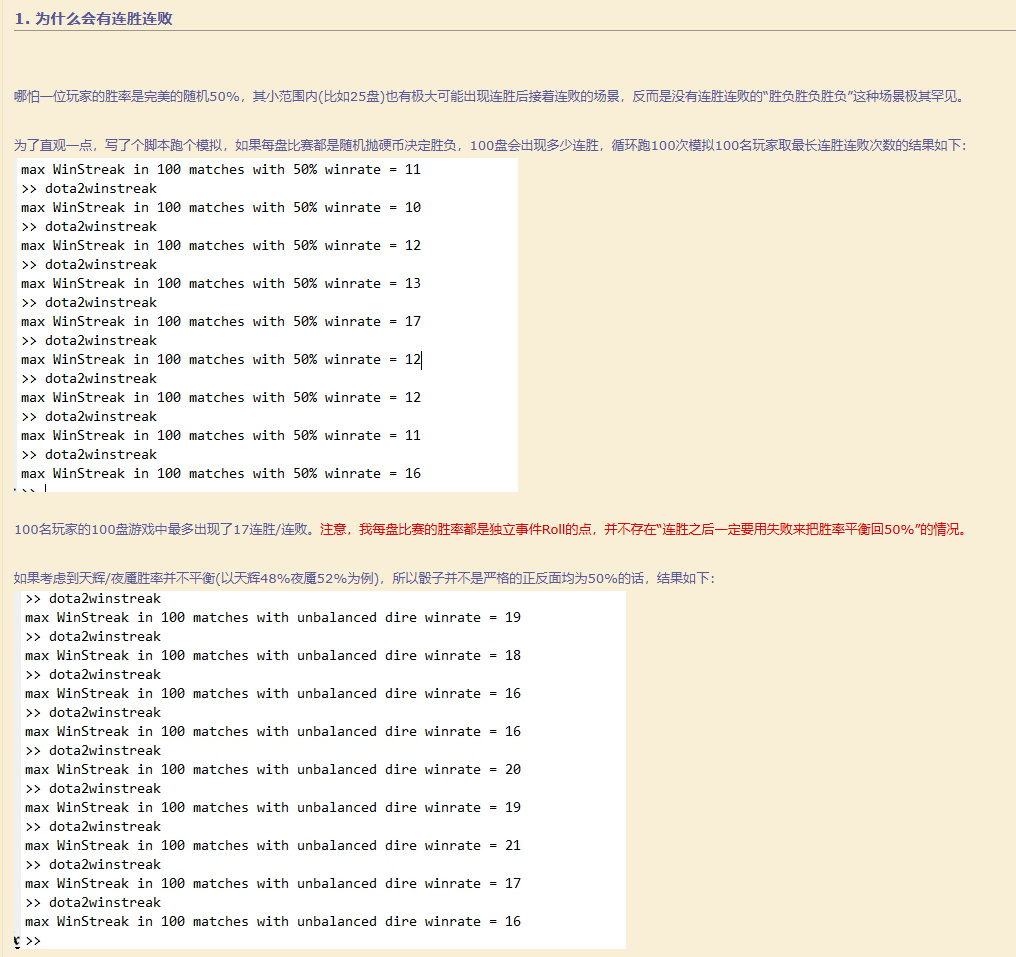大概四五年前的时候,我在NGA的DOTA2板块见过一次持续数个月的“V社到底有没有控制50%胜率”讨论,那时有位玩家(@WaterEast)跑了个模型,从数学角度论证了一下“为什么连胜之后接连败(以及连败之后接连胜)都是正常的数学现象”。