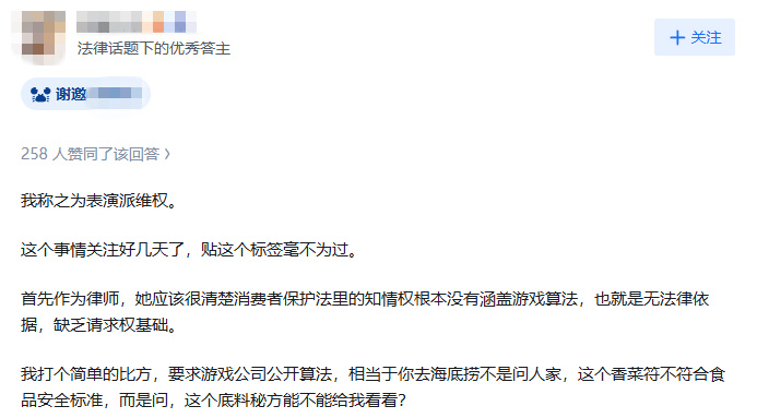 因此也有法律人士对此事持强烈否定态度,认为要求游戏公司公开算法,就像要求餐饮企业公开菜谱、秘方,比较不符合常理。