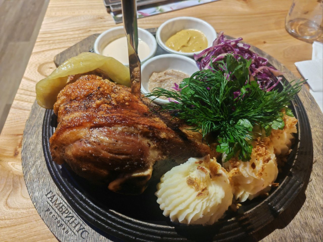 不适合一个人吃,我一天没吃饭的情况下吃这一个大肘子,吃完我足足缓了半个小时再一步一步挪回地铁站的。1580🦌的套餐里包含了一块大肘子,维也纳酱(反正是这么翻译的我真不知道是啥),芥末酱和奶油(酱?),至少够两个人吃,三口之家也是绰绰有余。我不知道德国肘子正常是什么样的,我只能说我吃的时候在给咬肌做力竭组,猪皮跟脆不咋沾边,肘子肉很嫩,味道非常不错。土豆泥很好吃,就是给的太多了。我因为受不了芥末的味道,所以维也纳酱(我不懂这是什么酱,味道还可以)和奶油酱(应该)沾的比较多,并在吃的发腻的时候狂沾维也纳酱。适合两个人来吃,分量刚刚好,如果4 5个人来还可以吃他们家3k多🦌的大号套餐。