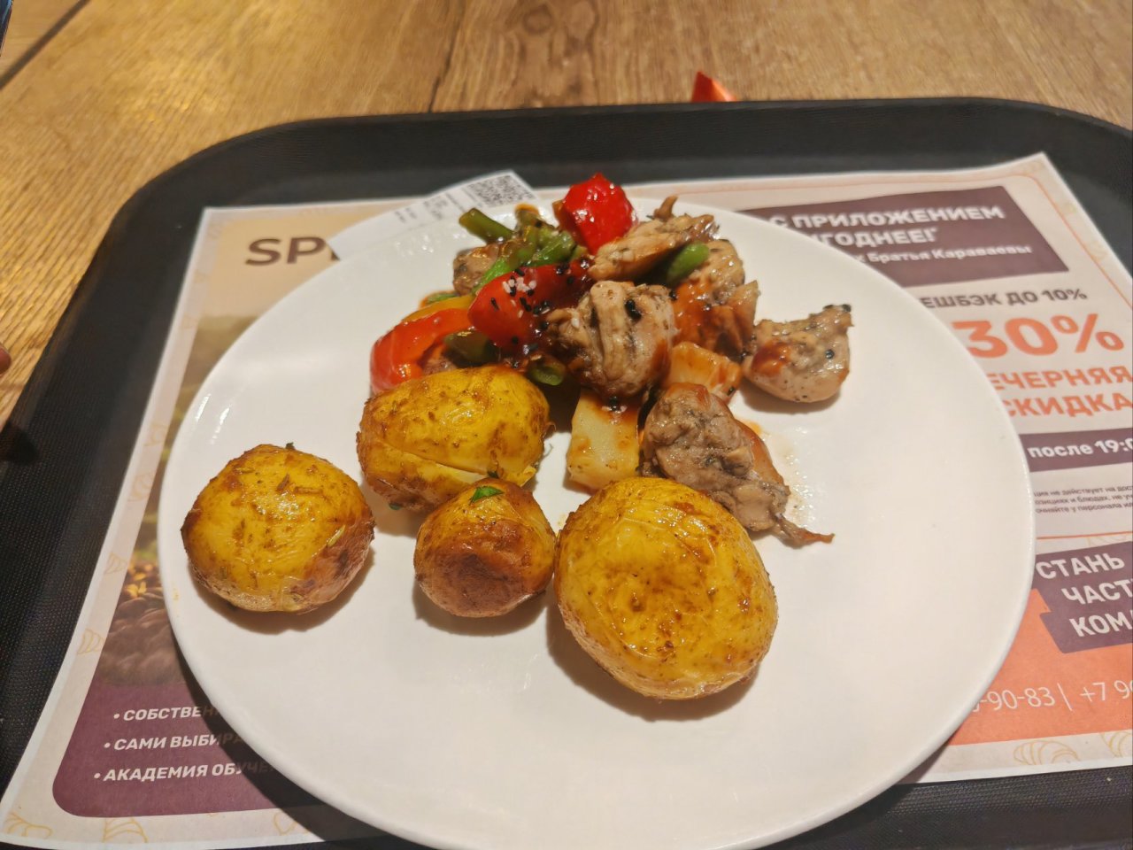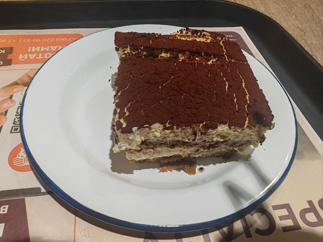 小红书很火的当地连锁餐厅,各位可以从第一张图看到他们的图标和他们变态的价格,这只是一块普普通通的鸡排,100g要你195🦌。我在青旅附近(6 7号线中国城站)晚上吃了一顿,在莫斯科大学1号线出来又吃了一顿,如果各位去莫大比较晚可以捎带脚来一顿尝尝。我记得我在去新圣女公墓的时候也路过过一家,但不记得具体位置了。芝士蛋糕还可以,小红书猛吹他家的提拉米苏,我吃完味道确实可以,但不至于说非吃不可,这个提拉米苏如果想吃别在饭点过了的时候再去,一般都没有了。烤小土豆和夏威夷风味鸡肉都很不错,可以一试。