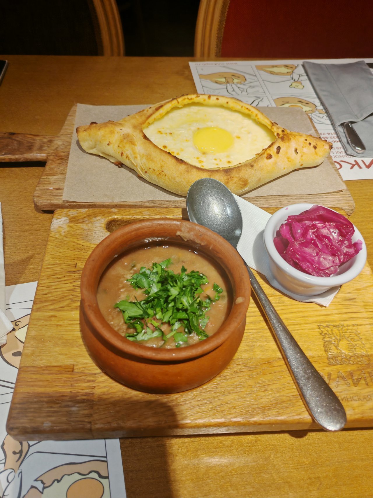 从俄罗斯回来我回忆吃了什么俄罗斯菜没有,发现完全没有记忆。这里的格鲁吉亚菜巨多,感觉没什么俄餐的位置。下面我将从御三家开始讲起。我个人口味一般,山猪容易吃不了细糠,还不爱吃葱花和洋葱(不吃洋葱在俄罗斯纯造孽),记忆也不一定正确。各位看个乐呵哈。如果感兴趣去小红书多查查,一般都有中文翻译菜单,以及一些菜品推荐。这边没有消费习惯,至少我吃的餐馆没有,别搁那活装嗷。
