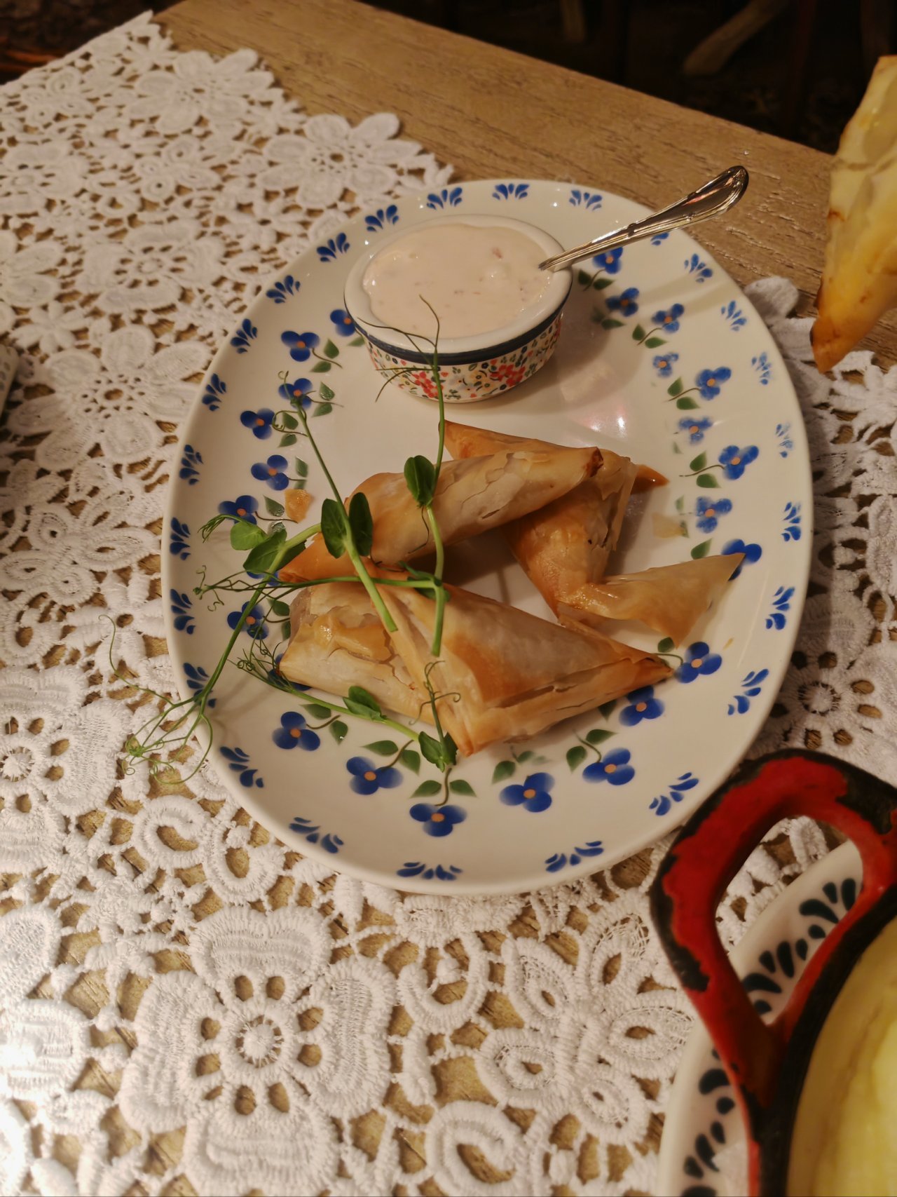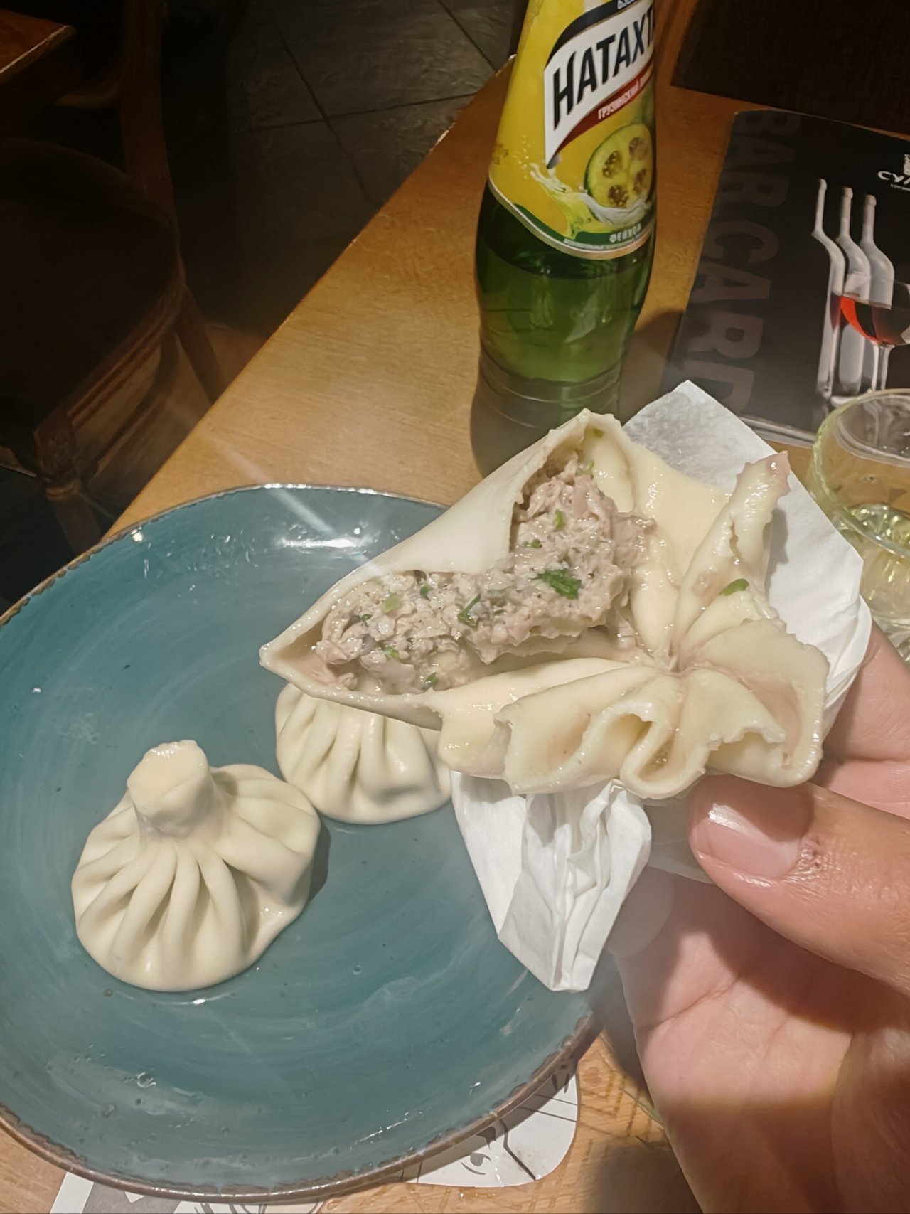 猪肉片就是国内的口味加上当地香草的味道,吃着倒是很过瘾。包子需要你先拿住那个粗的面头,咬个口把汤汁喝了再吃馅,肉馅包子因为里面的香草不会很腻,挺好吃的。别吃那个面头嗷,里面都没熟,就是让你拿着用的。鹰嘴豆汤吃起来就像是豆角里的豆配上烧茄子的味道以及当地香料的混合,不难吃。这个芝士船我是真的不懂,可能是需要把上面的蛋和下边混合?吃这个东西要把面揪下来蘸着芝士和鸡蛋液吃,有种卸船板烧柴火的感觉。我当时吃的时候完全感觉不出来好吃在哪,面饼揪多了蛋液会漏出来流半桌子,不沾蛋液没味,沾了蛋液又会咸到爆炸(我真的不知道为什么一蘸鸡蛋就咸)我只吃了一小半,鹰嘴豆汤也只喝了一半,把其他的炫完跑的。