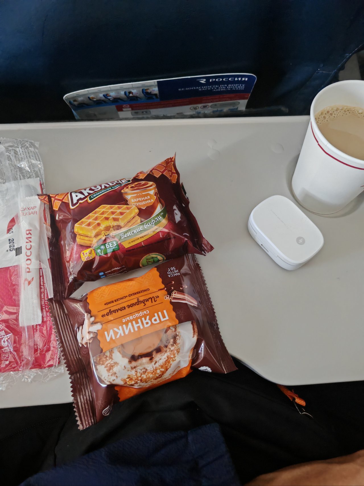我去伏尔加格勒到飞机坐的是俄罗斯航空(?)一个红色的R,不是大家熟知的俄联航。2个多点的飞机给了点小甜点,一个华夫饼和一个肉桂甜甜圈。华夫饼很好吃,肉桂甜甜圈真是难吃的批爆,我靠咖啡勉强塞进去一半就吃不动了。
