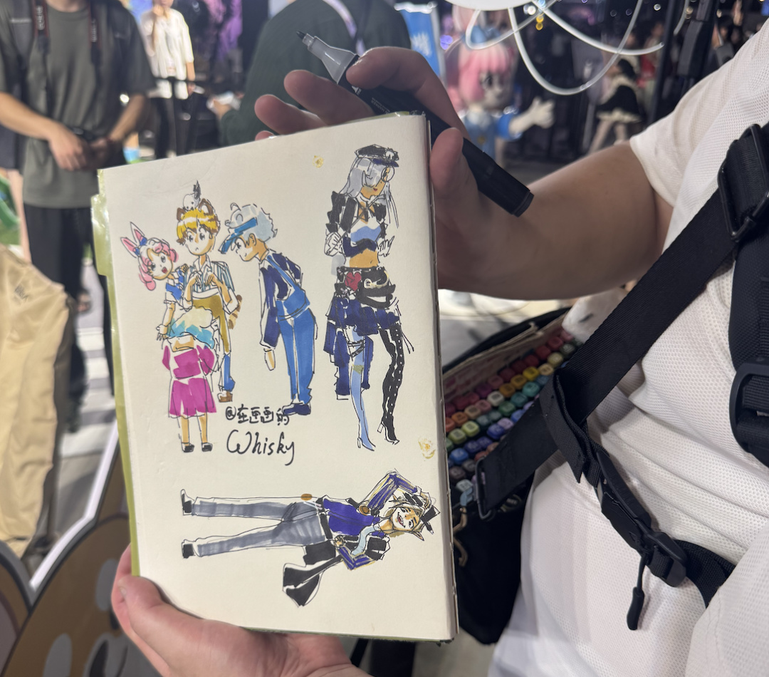 一名随身挂着一整盒马克笔,在场内画速写的画手,直到我离开前,还在画《心动小镇》的安妮Coser。