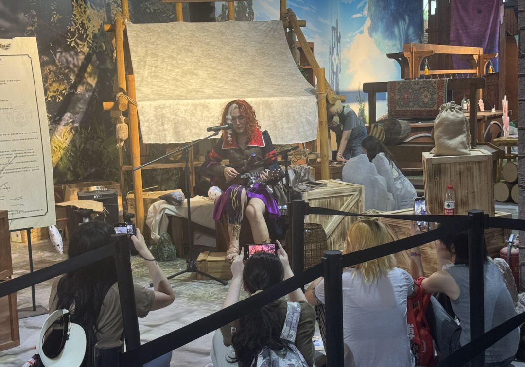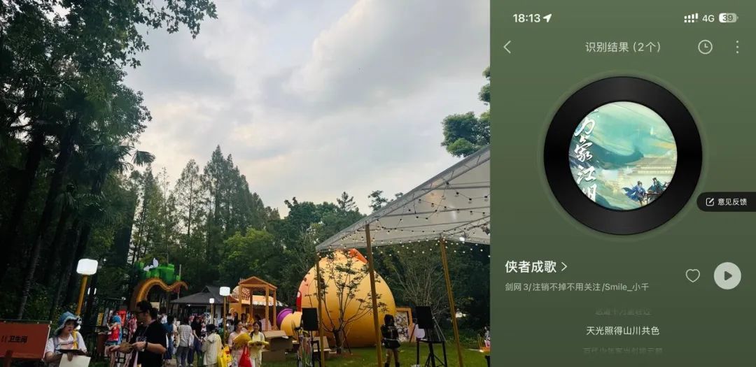 再比如经过剑网三的展区,抬头看天的时候,刚好碰见音响里放《侠者成歌》的「天光照得山川共色」。