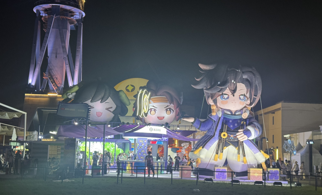 因为没有舞台演出票,我从舞台的后侧离开。虽然不在现场,但那里依旧聚集着很多玩家,大家站得很远,因为地势较高,可以勉强瞥到舞台的屏幕。我看到有人跟着音乐节拍挥着荧光棒,也看到有人仿若场内观众一样,在歌手互动的时候发出尖叫。