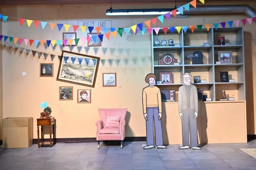 锈湖系列的展区则还原了游戏中的生日蛋糕和大合照——在小红书上,玩家们也经常把自己P成小黑,放到游戏的场景里。一切看上去有点让人发毛,也很契合游戏的悬疑气质。