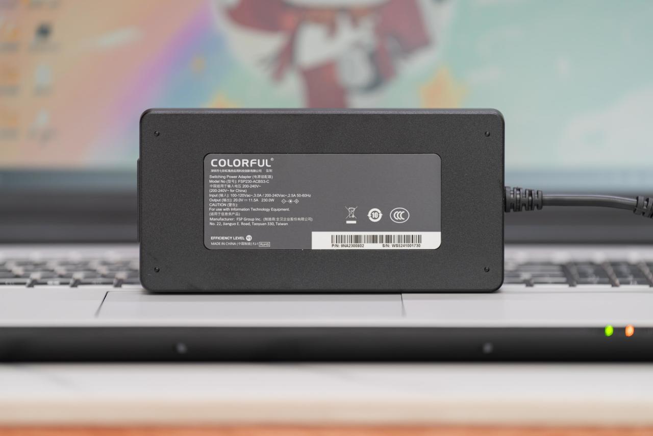 此外,熊猫本的电源适配器也是非常小巧精干的,适合出门通勤。因为它的输出功率仅有 20V × 11.5A = 230W,这都离不开 RTX 5060 系列显卡和 13 代 i7 处理器的功耗优势。