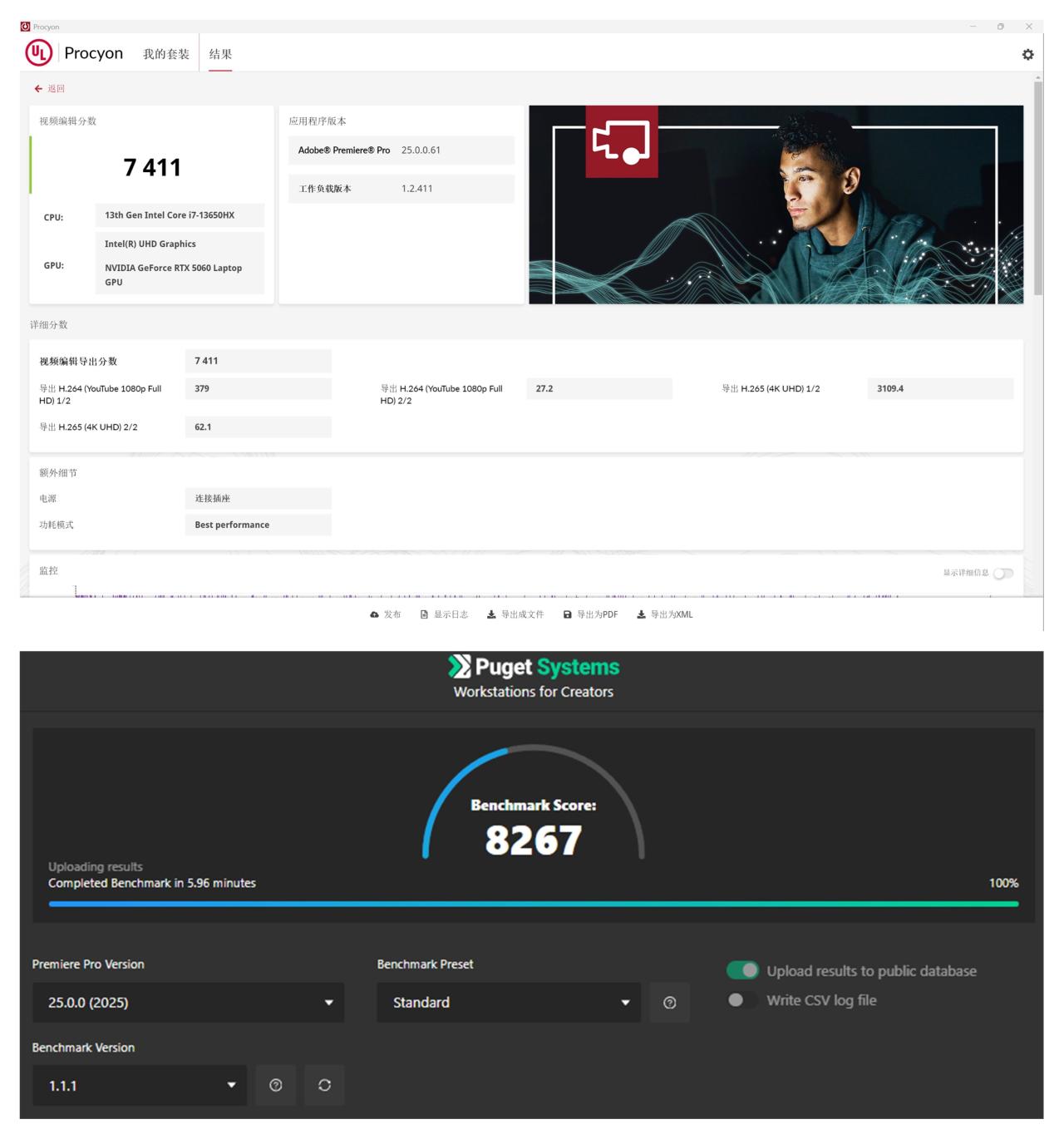 在 Adobe Premiere 的「Procyon 的视频编辑场景测试」,视频编辑导出分数为 7411 分。在「Pugetbench for Adobe Premiere」测试中得分 8267 分。