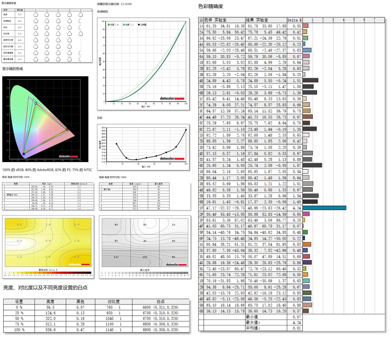 在「屏幕素质」方面,通过红蜘蛛 X 进行了校色之后测试,可以看到这块屏幕覆盖了 100% sRGB 色域、75% NTSC、80% Adobe RGB、82% P3。伽马曲线为 2.2 光度、屏幕最大亮度 539.6nits、对比度 1140:1、白点 6910K(偏冷)、色度均匀性差值 2.6,亮度均匀性差值 11%,色准 ΔE 平均 0.81,显示器额定值四星半。