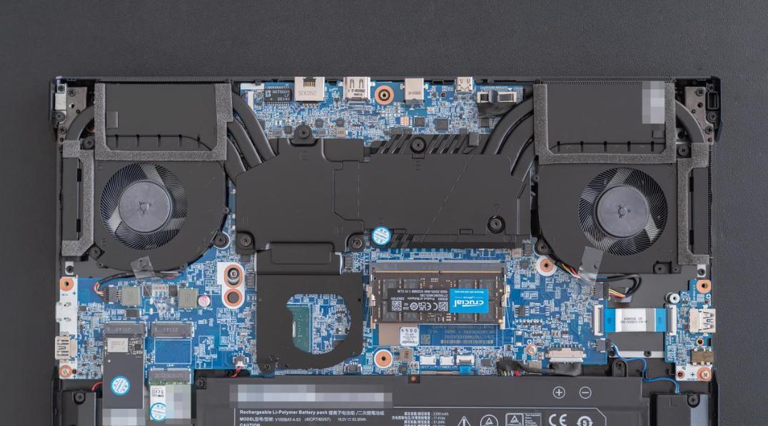 首先在「散热模组」上,熊猫本采用了双风扇三热管的设计,甚至还预留一个小风扇的位置,它就属于 i7-14650HX 机型上的散热配置了,还会额外增加 2 根热管。