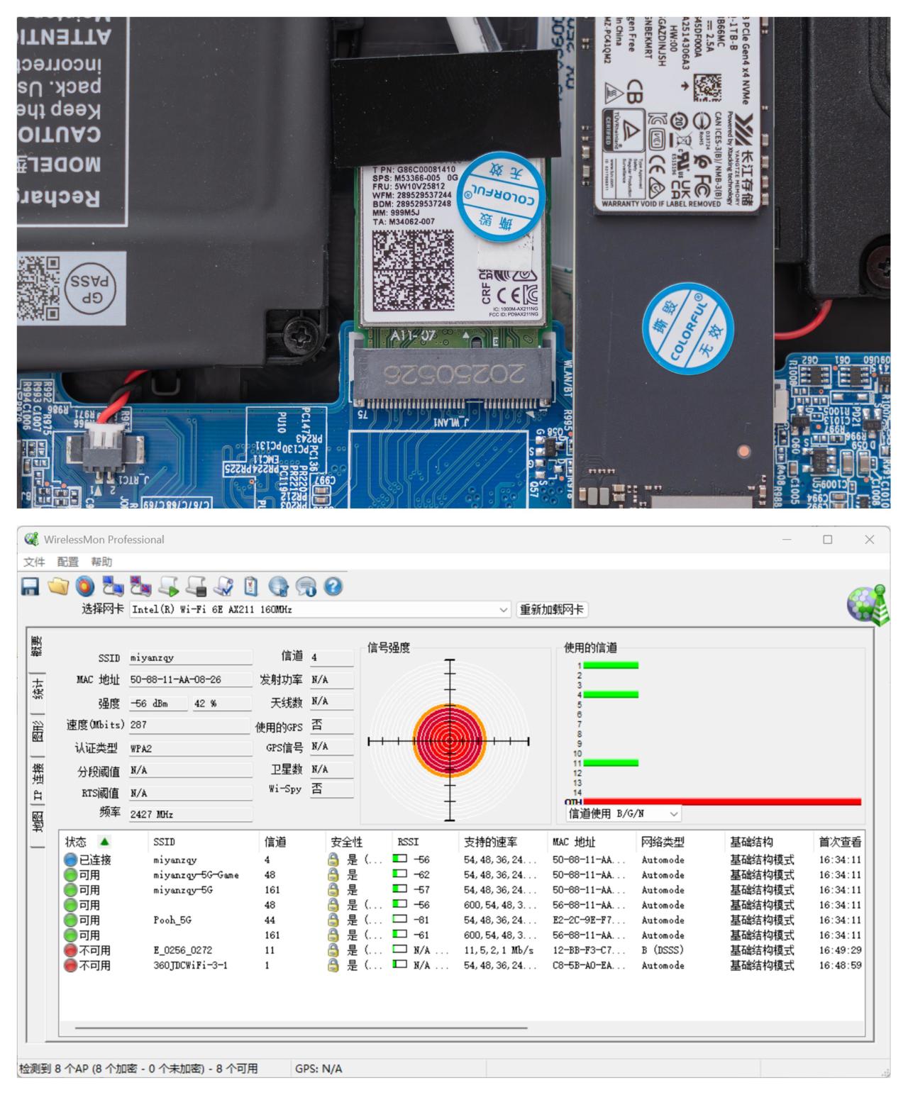 在网卡方面,熊猫本搭载了「英特尔 AX211 NGW 无线网卡」,拥有双天线,支持 2.4GHz、5GHz 及6GHz(160MHz) 三个频段,峰值带宽 2.4Gbps,支持 Wi-Fi 6E 信号,集成了蓝牙 5.3。