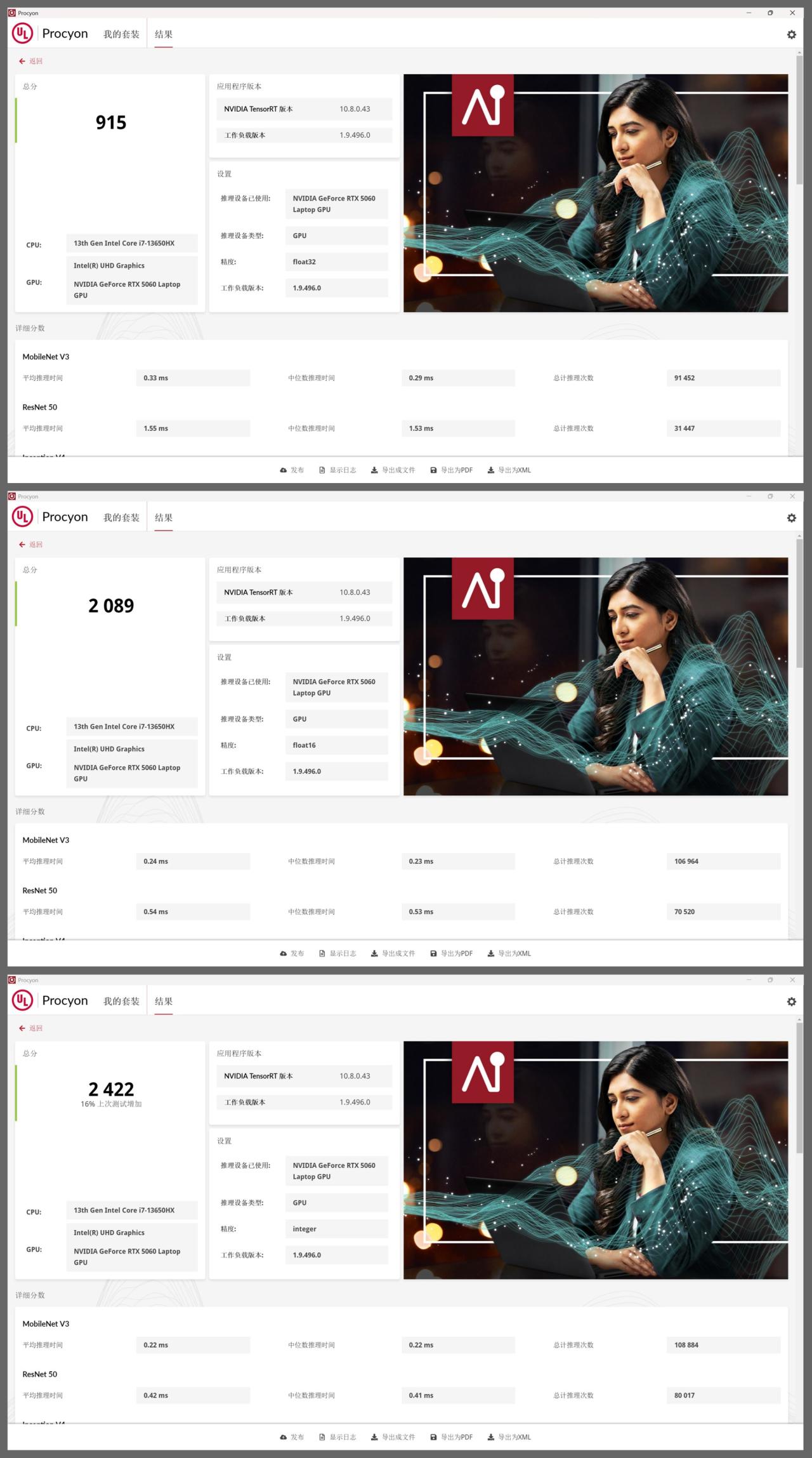 然后我们再看看 Procyon 的【AI 视觉】测试套件,通过测试可以看到 i7-13650HX + RTX 5060 取得了不错的成绩。在「NVIDIA TensorRT」套件中:float32 精度得分 915 分、float16 精度得分 2089 分、integer 精度得分 2422 分。