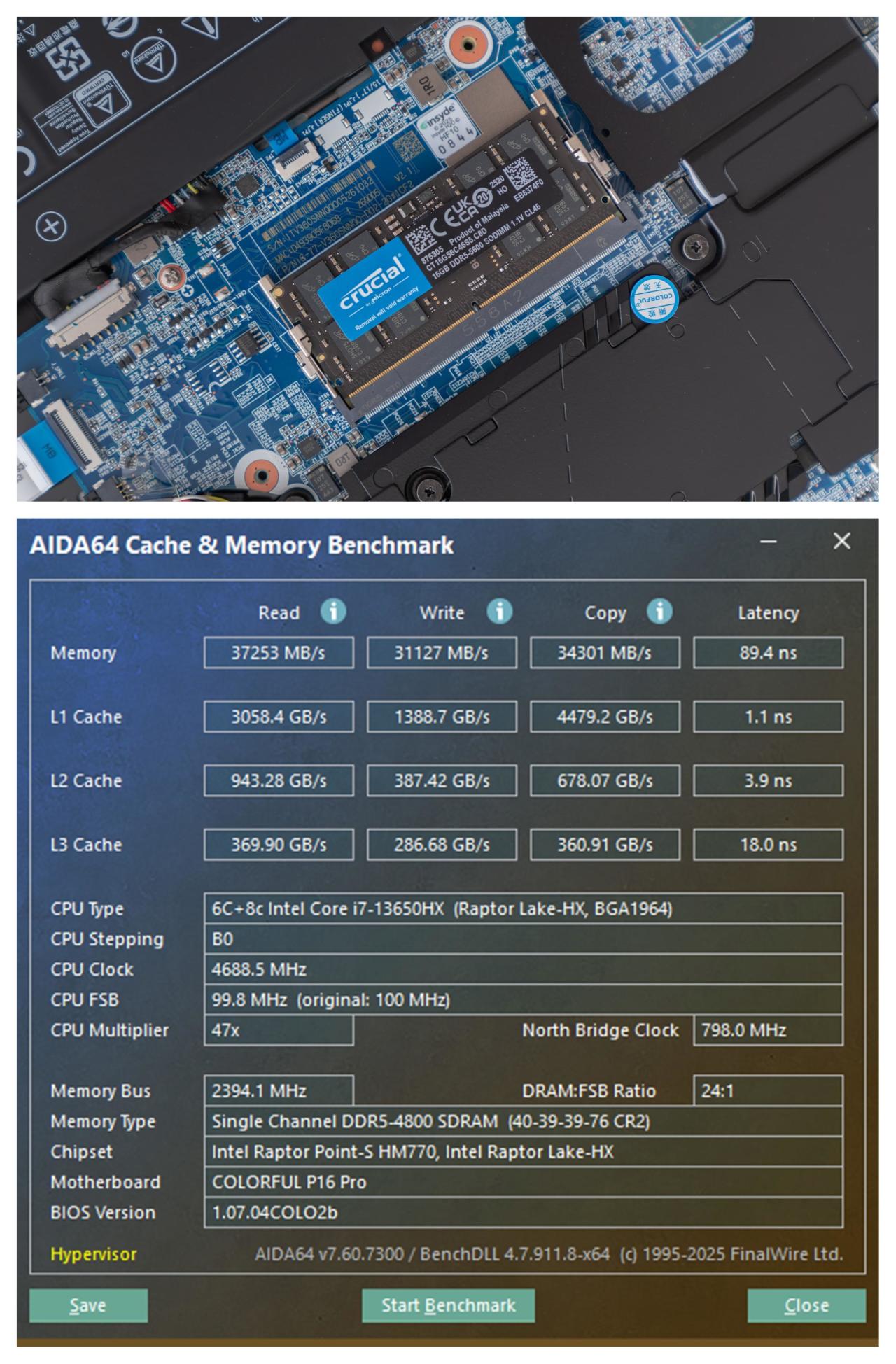 在内存方面,熊猫本搭载了一根「英睿达 16GB 4800MHz DDR5 内存条」,非常适合用户自行升级,通过 AIDA64 的内存测试之后可以看到,内存时序为 40-39-39-76 CR2,读取速率为 37253MB/s、写入速率为 31127MB/s、复制速率为 34301MB/s、时延 89.4ns。L3 Cache 的读/ 写 / 拷贝数据分别为 369.90GB/s、286.68GB/s、360.91GB/s、时延 18.0ns