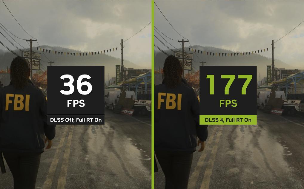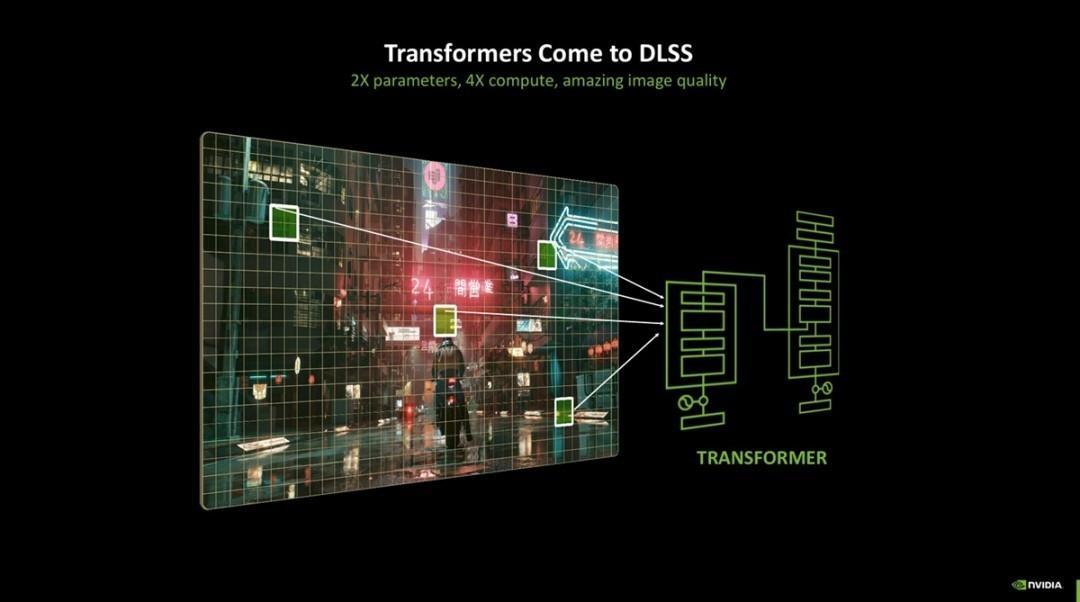 然后这次 RTX 50 系列显卡还升级了 DLSS 4 的功能,它被命名为「多帧生成」,相比于只能补一帧的 DLSS 3(帧生成),它基于 Transformer 模型的图像处理方案,利用 AI 可以按照 2×、3×、4× 补出最多 3 帧。所以 2× 就可以理解为是 DLSS 3 版本,而 3×-4× 就是 DLSS 4 的技术了。