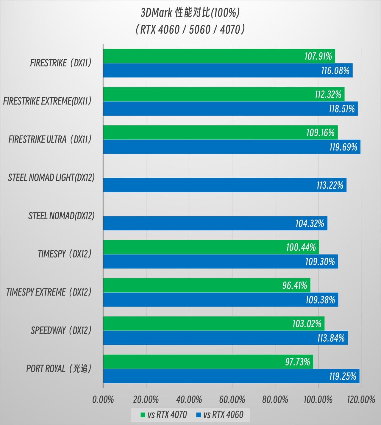 可以看到 RTX 5060 相比于 RTX 4060,DX11 性能提升 16.08%-19.69%,DX12 性能提升 4.32%-13.84%,光追性能提升 19.25%。对比 RTX 4070,DX11 场景也有小幅提升,DX12 基本持平。