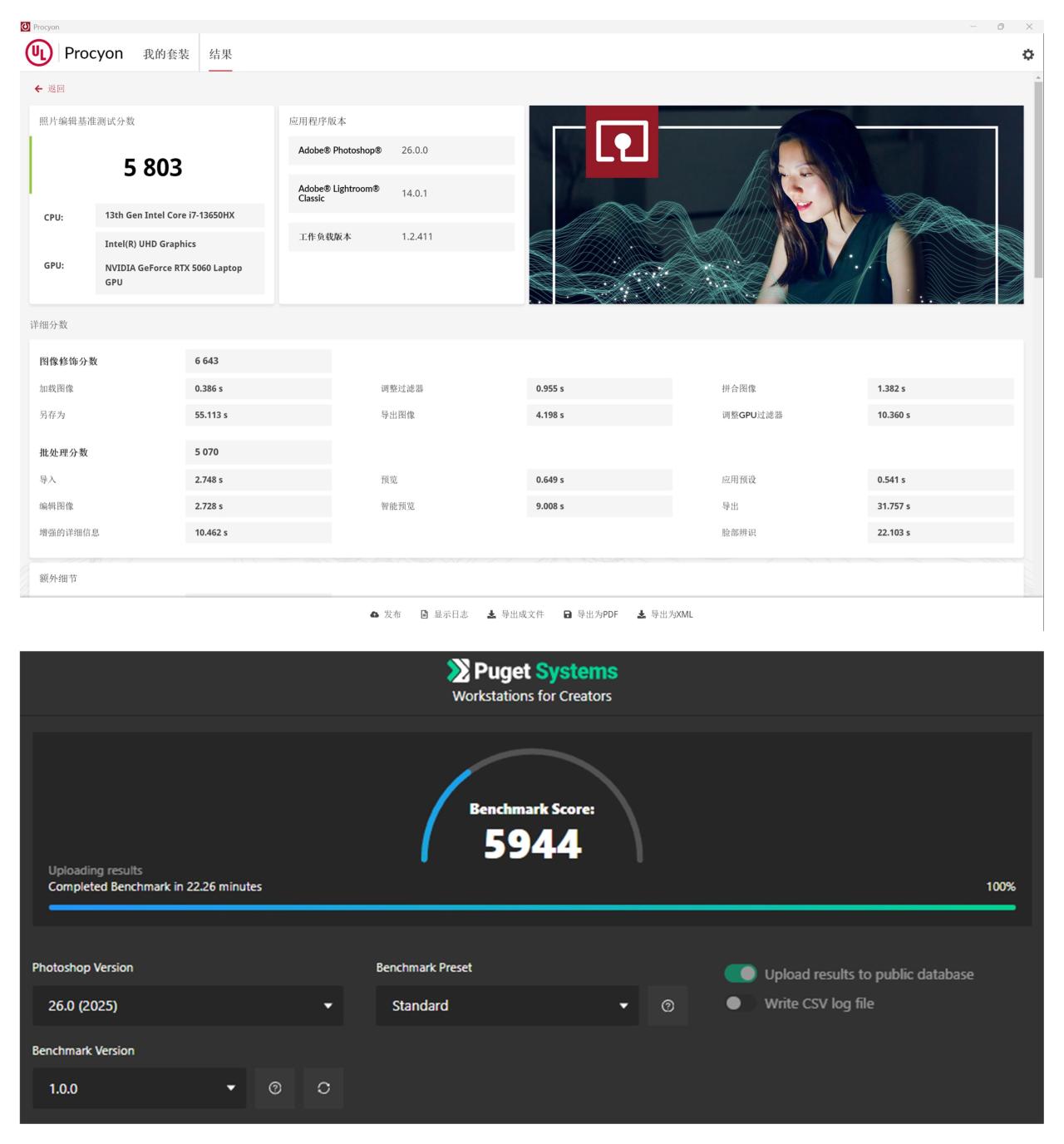 在 Adobe Photoshop 和Lightroom 的「Procyon 的照片编辑基准测试」,的图像修饰分数拿到了 6643 分,批处理分数 5070 分,总分 5803 分。在「Pugetbench for Adobe PhotoShop」测试中得分 5944 分。
