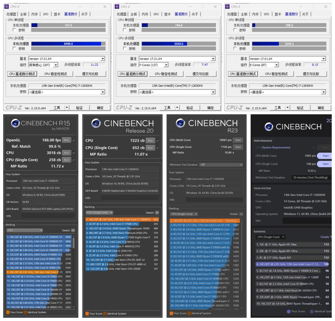 我也借助了一些专业软件来测试 i7-13650HX 移动处理器的性能表现,数据汇总如下所示,大家可以参考对比下自己处理器的表现: