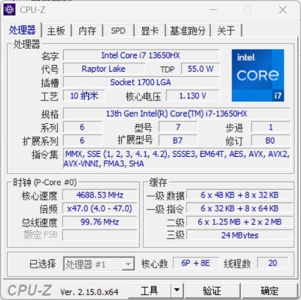 「处理器」:英特尔 i7-13650HX(14 核心 / 20 线程,3.6GHz / 4.9GHz)
