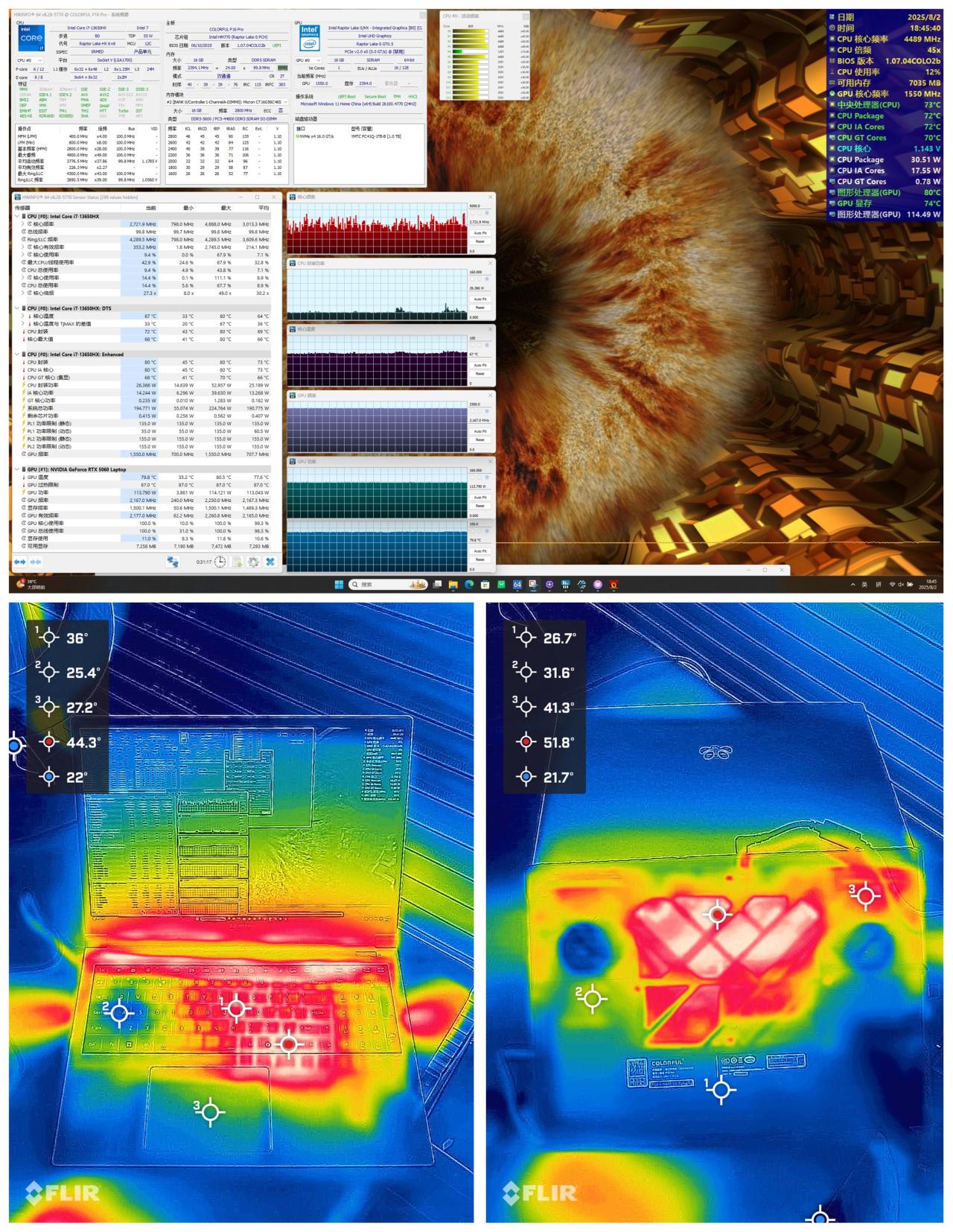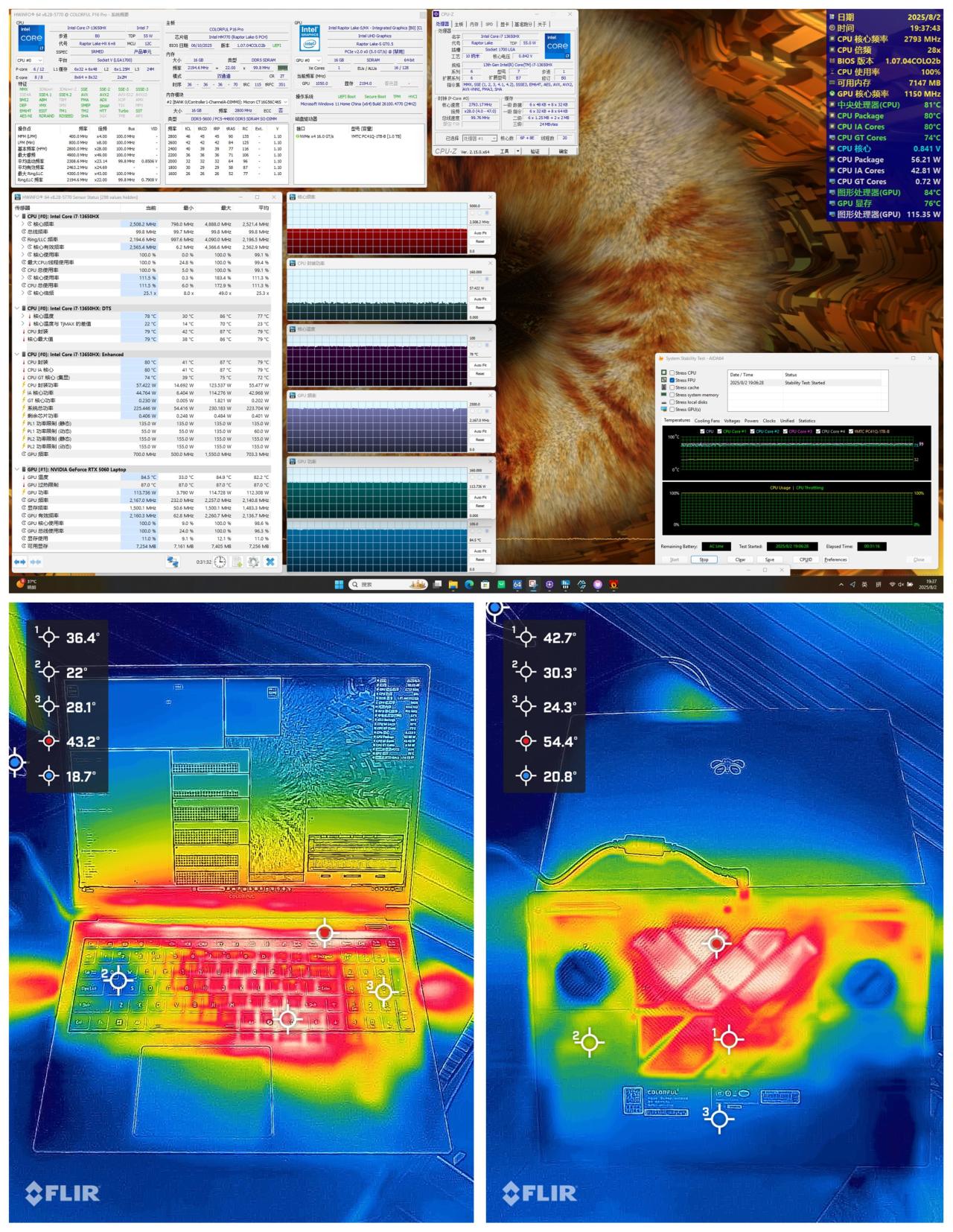 最后在 30 分钟的「AIDA64 FPU + FurMark 双烤测试」,可以看到 CPU 主频为 2.793GHz,温度为 81℃,封装功耗为 56.21W。而 GPU 的频率为 2167MHz,功耗为 113.736W,温度为 84.5℃。CPU + GPU 的总功耗为 170W 左右。在外壳温度方面,C 面最高温度为 43.2℃,D 面最高温度为 54.4℃,而与用户手感相关的 WASD 键帽区域温度控制出色。
