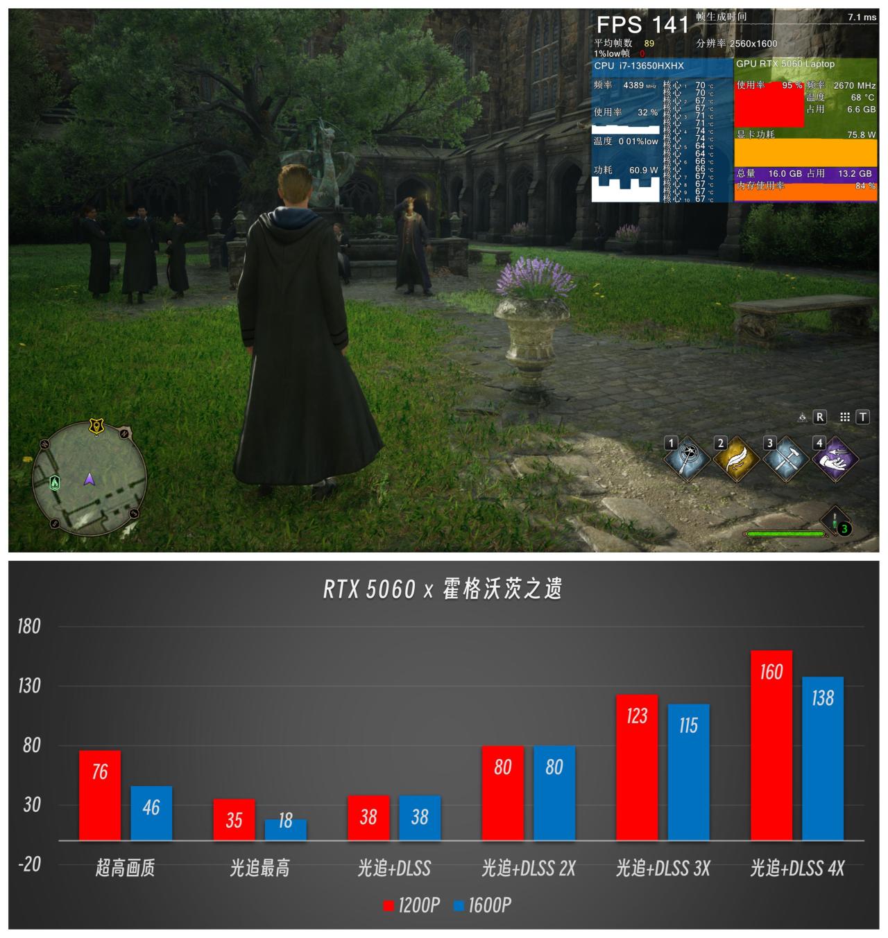 接下来是《霍格沃茨之遗》,可以看到熊猫本在 1200P 超高画质下,帧率达到 76fps,开启光追后帧率降低至 35fps,但 DLSS 2× 技术的使用使帧率提高到了 80fps。而 DLSS 3× 和 4× 更是将帧率提高到了 123fps 和 160fps。
