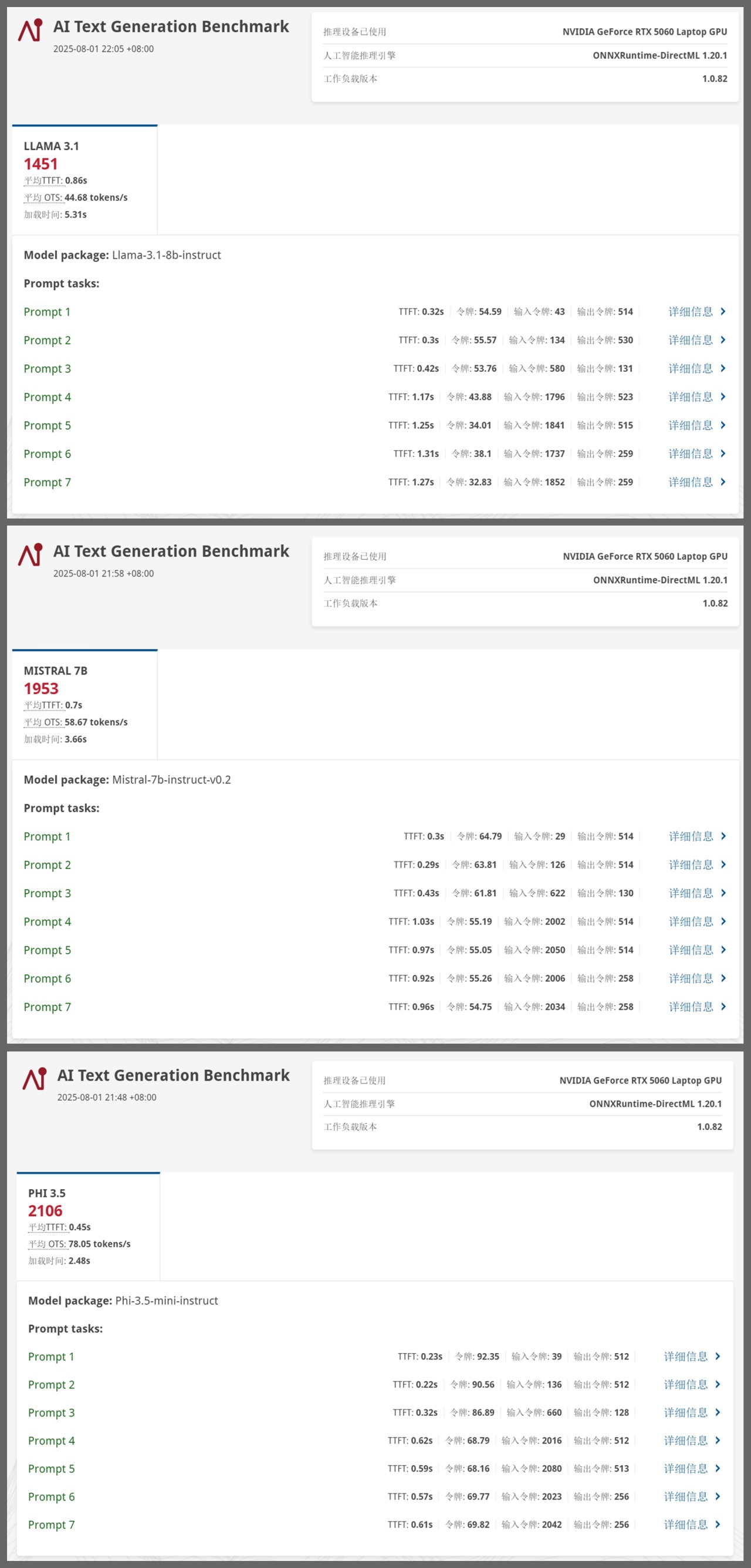 然后在【AI 大语言模型】测试套件中,PHI3.5 模型得分 2106 分,平均 TTFT 0.45s,平均 OTS 78.05 token/s,加载时间 2.48s;MISTRAL 7B 模型得分 1953 分,平均 TTFT 0.7s,平均 OTS 58.67 token/s,加载时间 3.66s;LLAMA 3.1 模型得分 1451 分,平均 TTFT 0.86s,平均 OTS 44.68 token/s,加载时间 5.31s。