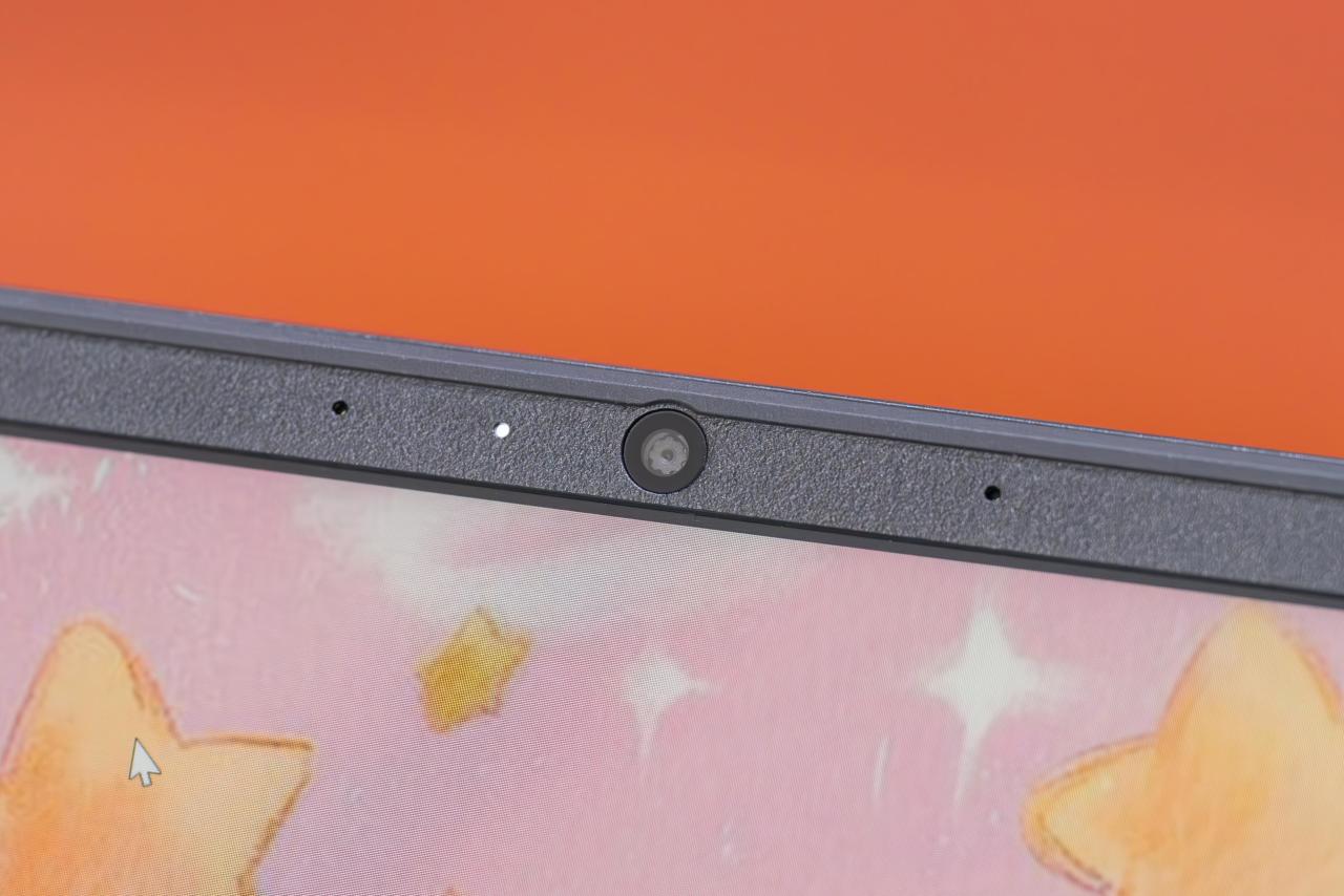 在屏幕顶框中部还有一个 720P 的摄像头,并配有白色的工作指示灯,两侧为阵列麦克风。