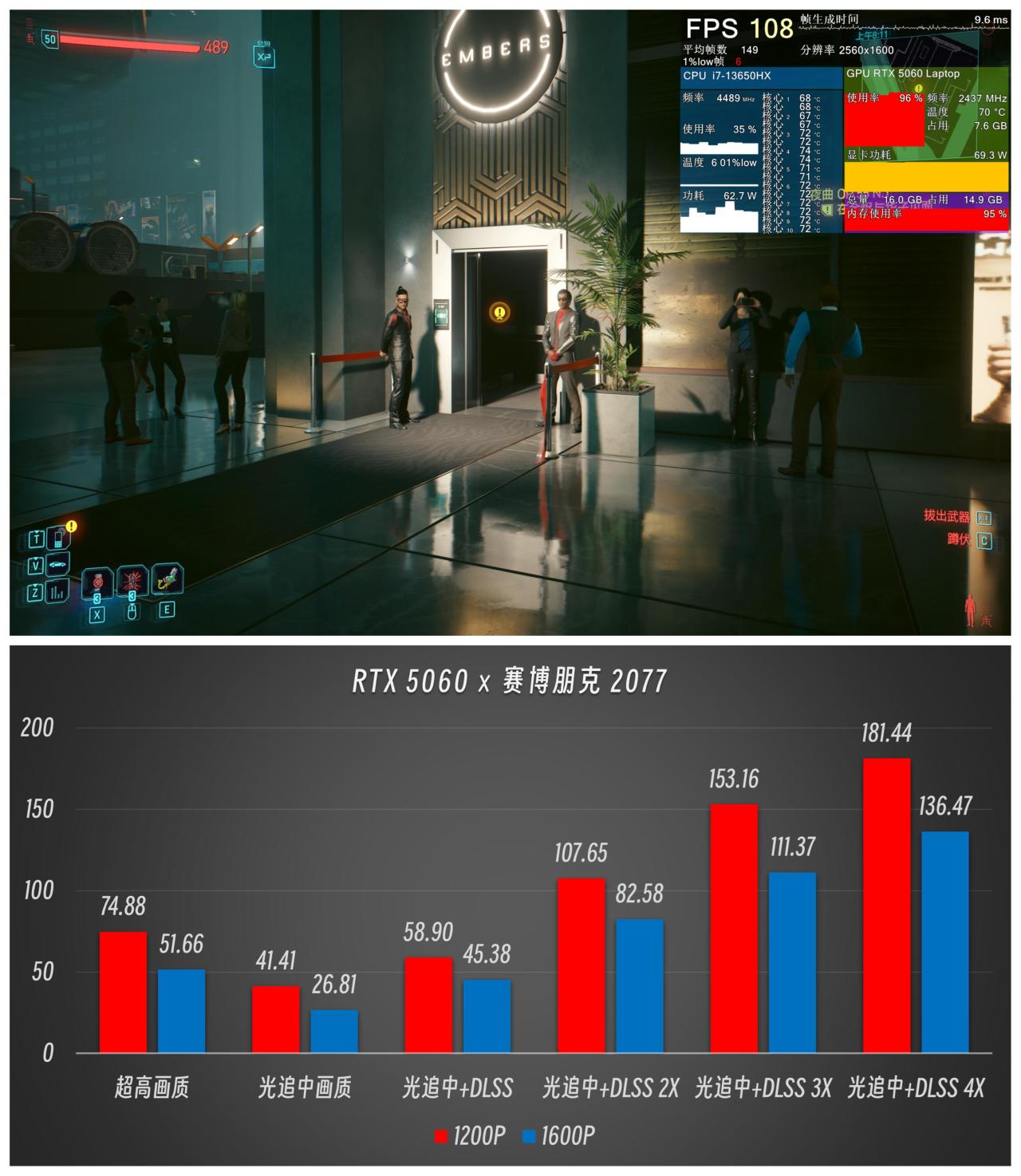 然后测试的是《赛博朋克 2077》,使用自带的游戏性能检测工具,统计结果如下,可以看到 1200P 压力不大,最高能到 181fps,1600P 部分选项出现了卡顿,最高能到 136fps。如果各位对于光追画质有要求,还可以在 DLSS 4 的基础上进行加码。