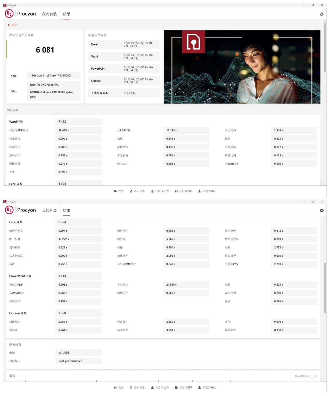 熊猫本在生产力场景测试中,性能表现也是相当不错的,首先是 Office 2021 套件的「办公室生产力」测试总分 6081 分,其中 Word 得分 7462 分,Excel 得分 6394 分,Power Point 得分 6314 分,Outlook 得分 3390 分。
