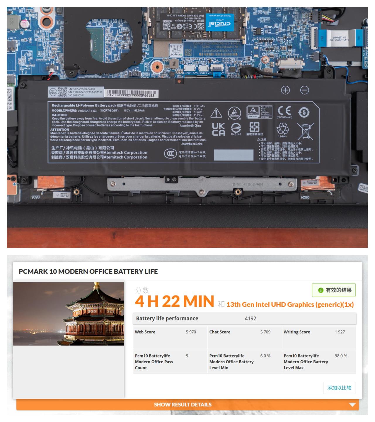 最后在电池方面,这台游戏本配备了「53Wh 锂离子电池组」,使用 PCMark 的办公场景进行测试,测试前将电源模式设置为最佳能效、分辨率调节至 1920×1200、分辨率缩放 100%、屏幕刷新率调整为 60Hz、屏幕亮度降低至 30%,开启飞行模式。实测电量从 98% 降至 2%,续航达到了 4 小时 22 分钟,得分 4192 分。