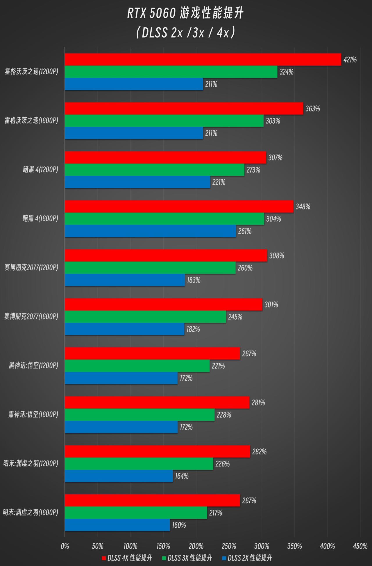 最后,我把前面测试过的热门 3A 大作的 DLSS 2×、3×、4× 提升数据做成一张表时,你就会发现 DLSS 4 技术确实提升显著,开启 DLSS 2× 后,就有 160-221% 左右的性能提升,3× 档位则是 217-324%,4× 档位更是来到了 267%-421%,相当的恐怖。