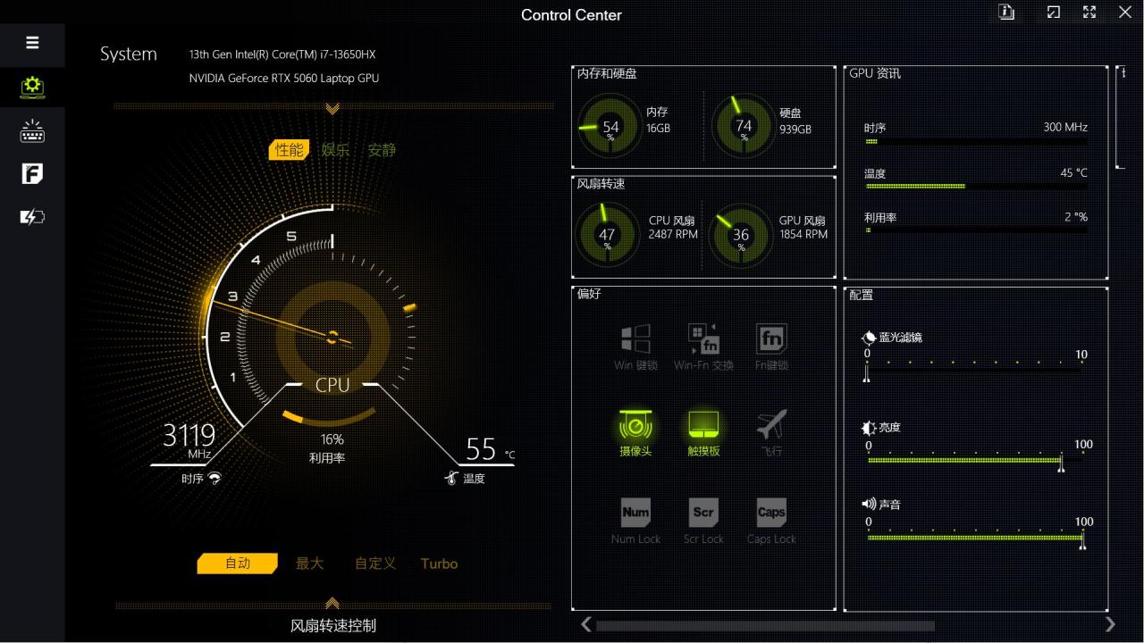 首先我们先来看看熊猫本的游戏性能,想必这也是各位游戏玩家最关心的环节。我们在测试中进行如下设置。如无特殊说明,本文测试环境默认为 26-29°C 的密闭空间,BIOS 版本为 1.07.04COLO2b,操作系统版本为 Win11(24H2)、NVIDIA 显卡驱动版本为 580.88,控制中心改为性能模式、风扇调节至最大档位,显卡开启独显直连。