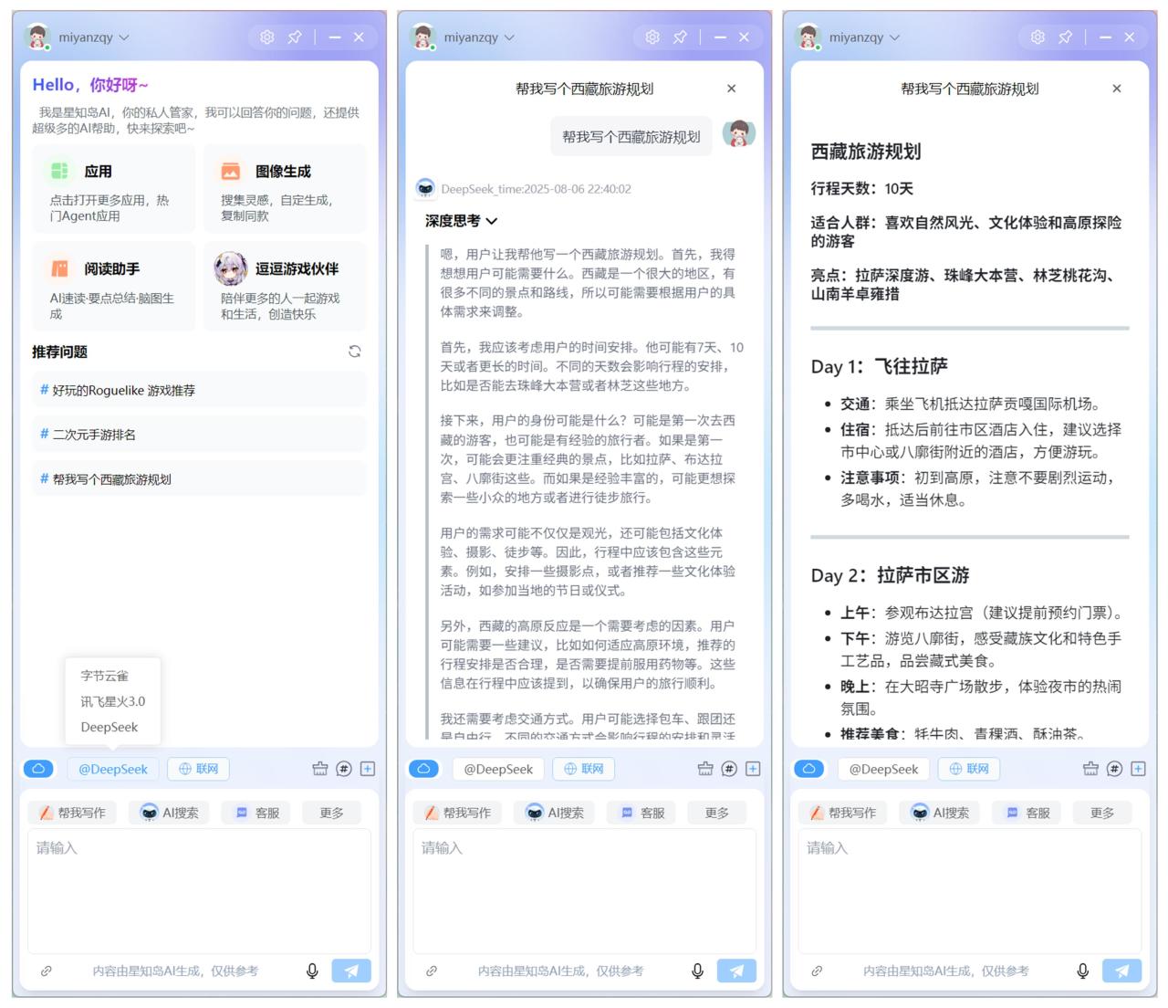 在星知岛的主对话框内,集成了 DeepSeek、讯飞星火 3.0、字节云雀三个大语言模型,并且支持联网,你可以快速调用 AI 工具帮你回答问题、撰写内容、文生图等操作。