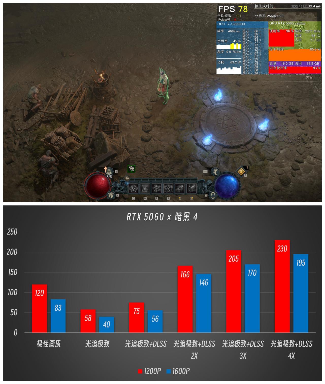 第五款测试的是《暗黑 4》,1200P + 极佳画质下帧率高达 120fps,开启光追后帧率下降至 58fps,DLSS 和 DLSS 3 锦上添花,分别达到了 75fps 和 166fps,开启 DLSS 4 的 3× 和 4× 之后,帧率达到了 205fps 和 230fps,直逼这款笔记本的屏幕刷新率上限了。在 1600P 下最高也有 195fps。