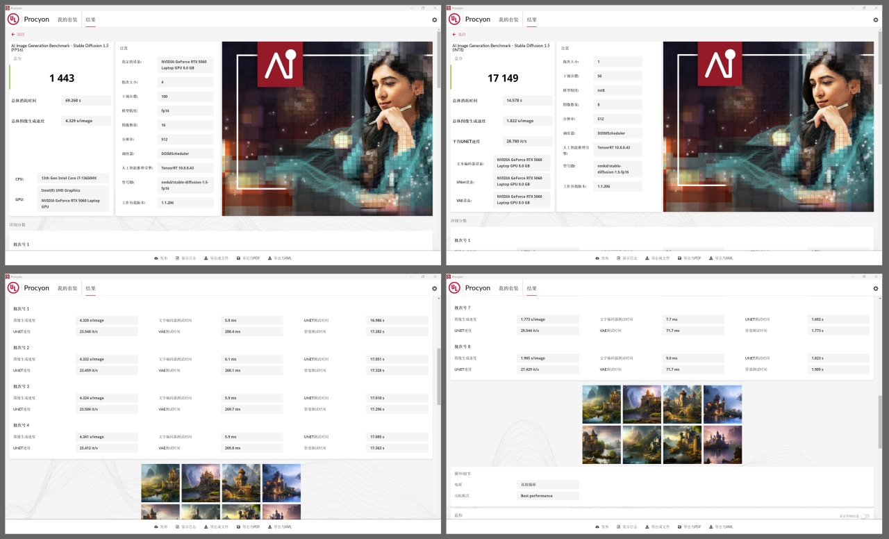 最后在【AI 文生图】的「Procyon-Stable Diffusion 1.5(FP16)」场景中,测试会创建 4 批 512×512 分辨率的图像,每批次 16 幅,整机测试得分 1443 分,图像生成速度为 4.329s/image,总体消耗时间 69.268s。