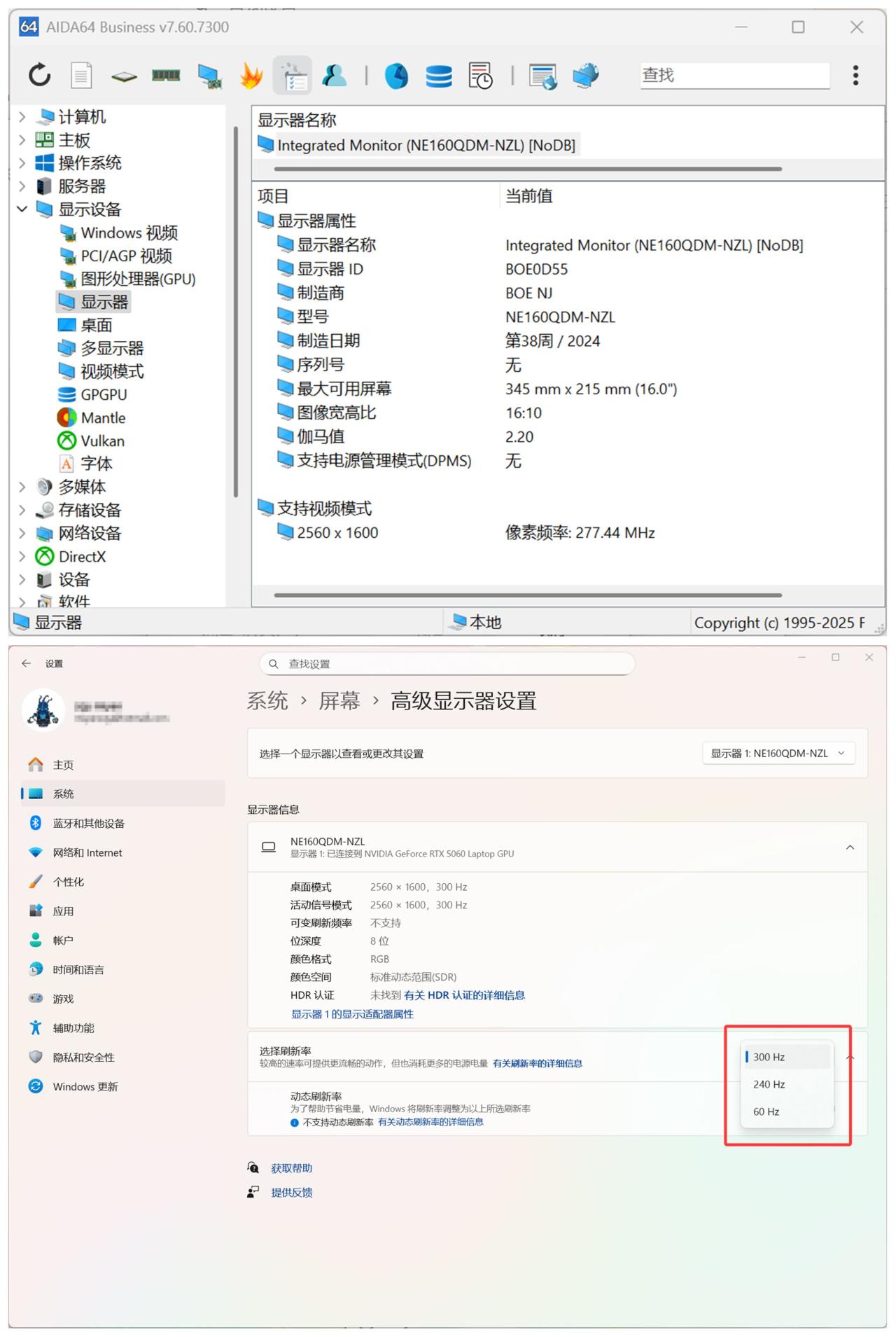 通过 AIDA 64 查询,可以看到熊猫本选用了一块来自于京东方(BOE)的屏幕面板,型号为 BOE0D55。刷新率支持 60Hz、240Hz、300Hz 共三档。