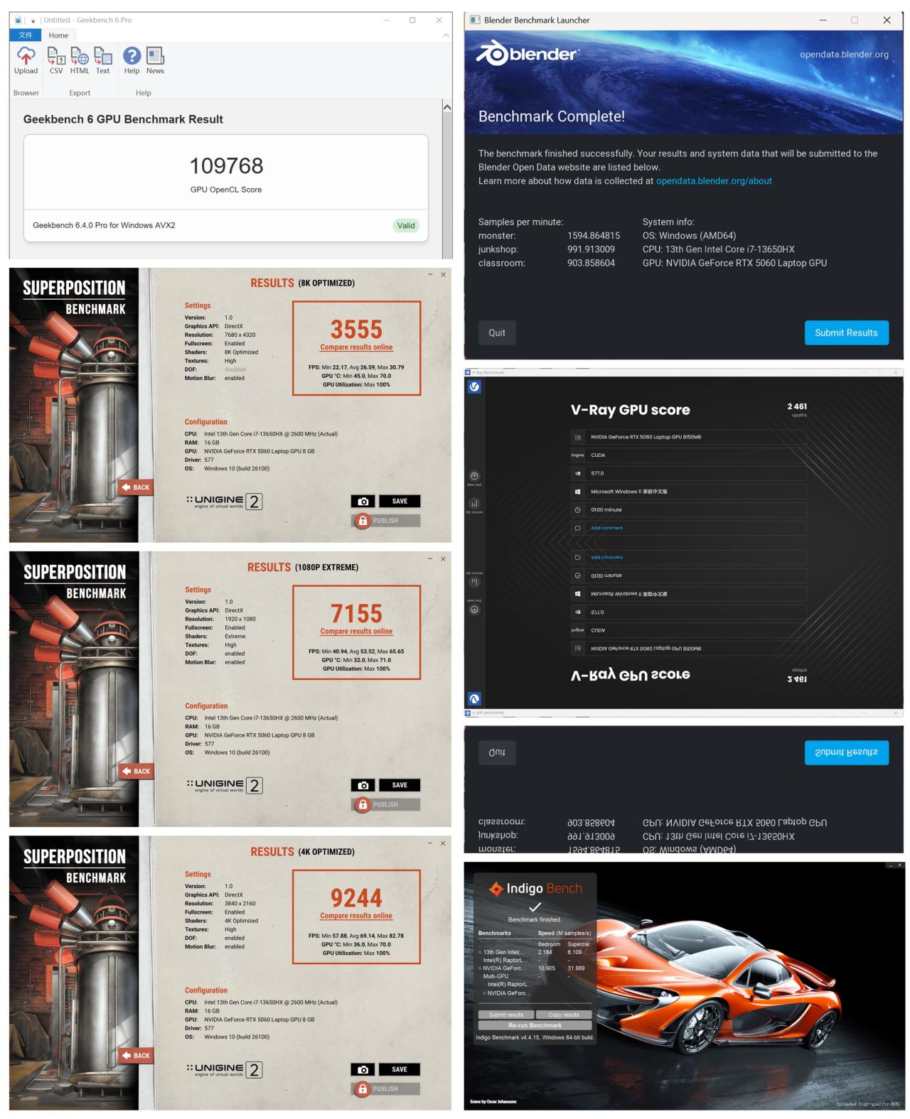 显卡测试软件「Superposition Benchmark」中,搭载了 RTX 5060 的熊猫本在 1080P-Extreme 场景得分 9244 分,在 4K-Optimized 场景中得分 7155 分,在 8K-Optimized 场景中得分 3555 分。在「V-Ray」测试中,GPU-CUDA 场景得分 2461 分,GPU RTX 场景得分 3677 分。在「GeekBench 6」测试中,GPU 得分 109768 分。