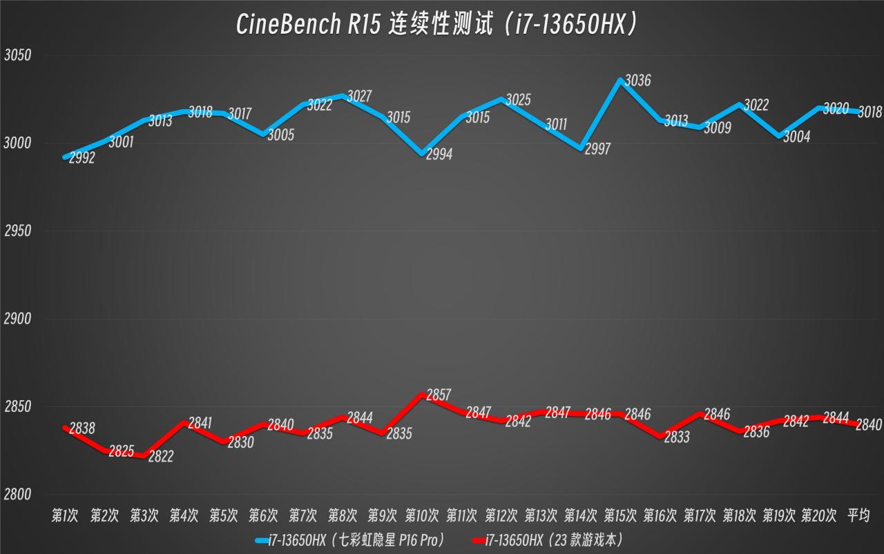 通过「CINEBENCH R15 连续测试结果」可以看到,熊猫本的 i7-13650HX 释放了 2992-3036cb 的性能区间,衰减率方面在 1.45%。对比同样是 i7-13650HX 的 23 款游戏本,平均性能提升了 6.27%,也可以从侧面反映出整机的性能释放更好。