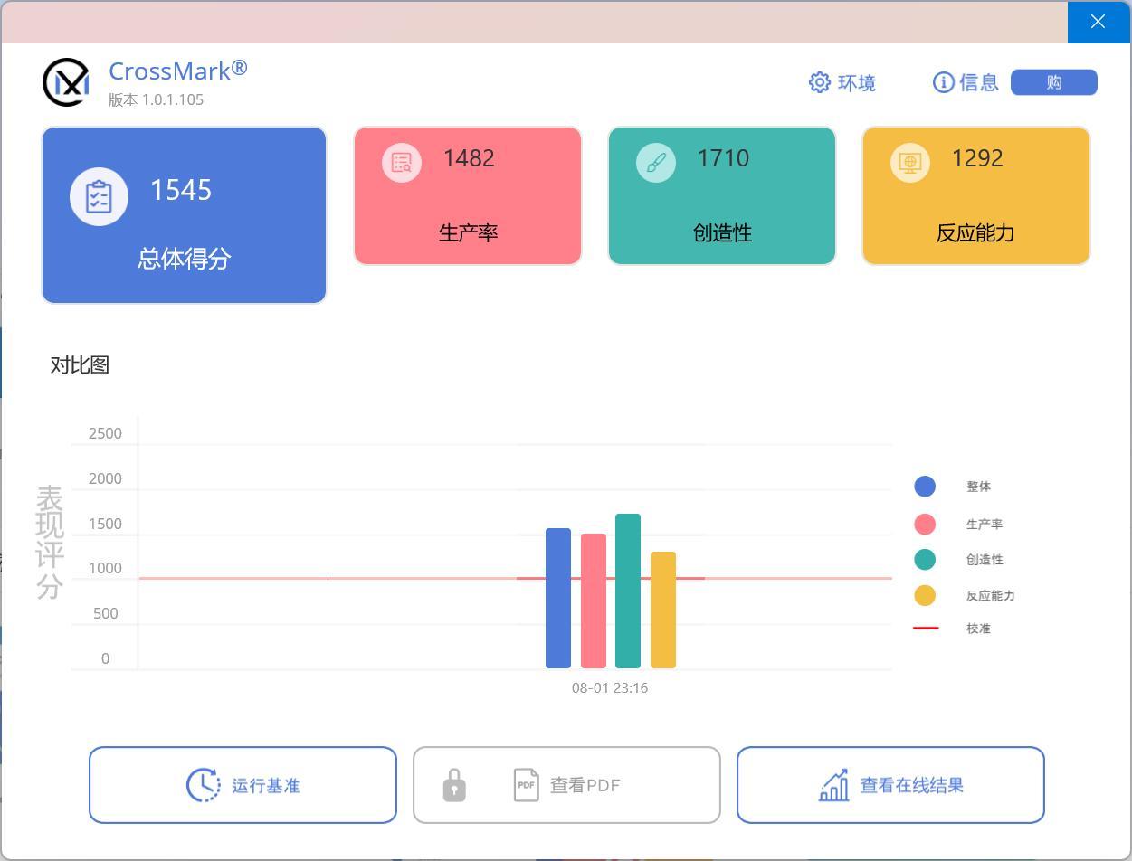 在「CrossMark」测试中,总体评分 1545 分,其中生产率得分 1482 分,创造性得分 1710 分,反应能力得分 1292 分。