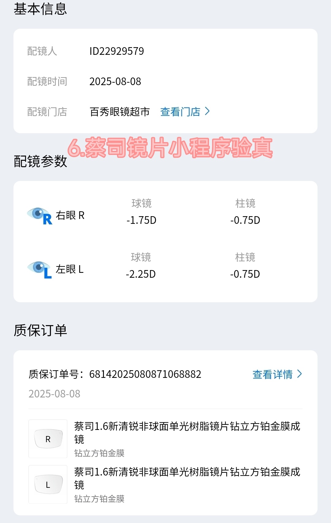 ②镜片:原厂包装上有防伪码,在蔡司晴选小程序上扫码选完左右眼之后,会要一个30s刷新一次的验真二维码,这个如果是线上配镜的话可以问商家要,之后就可以知道是否是正品了。