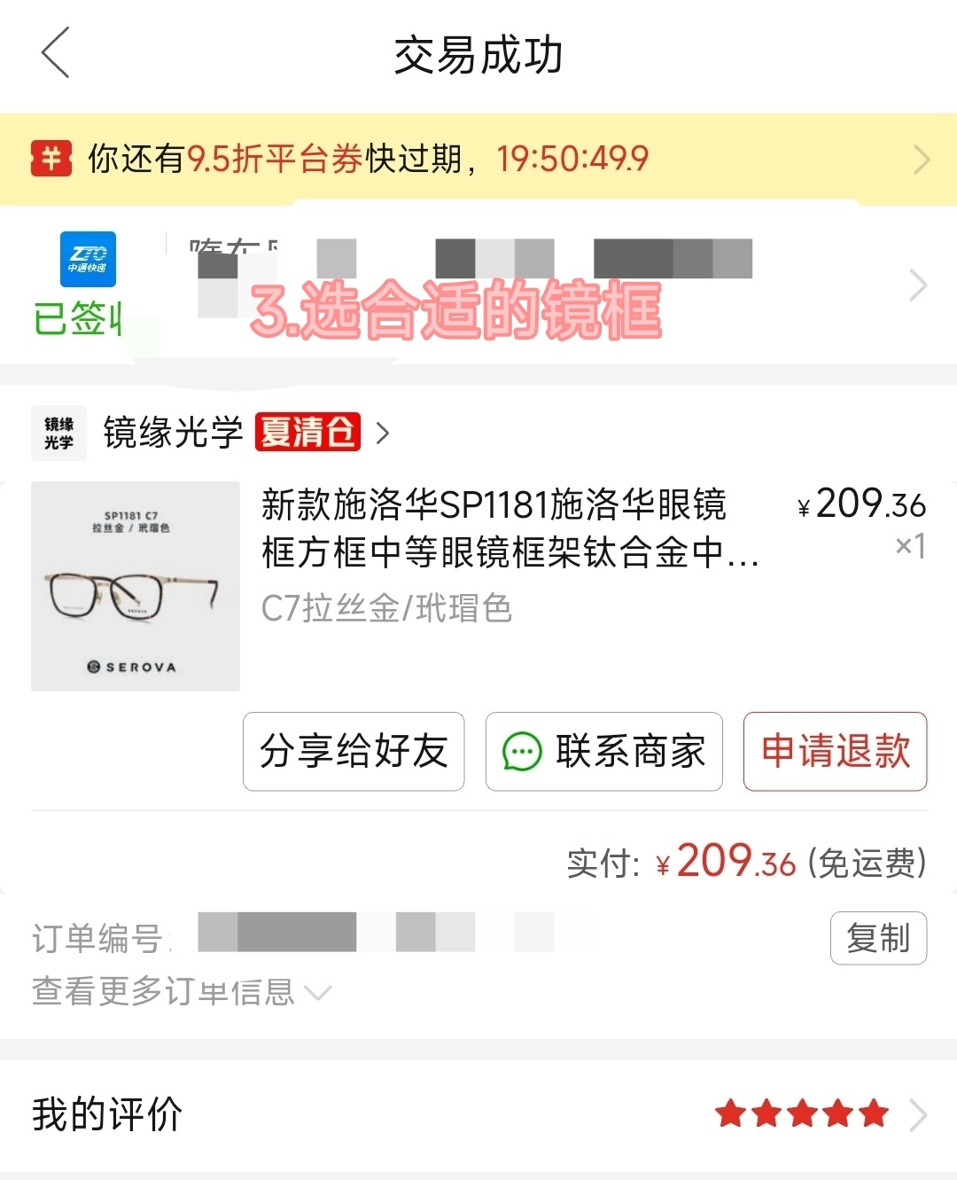 3.镜片:看的帖子和评论区,选购了蔡司新清锐铂金膜,在PDD买的,感觉该商家前前后后态度都很不错,后面找他鉴真啥的也都挺配合。