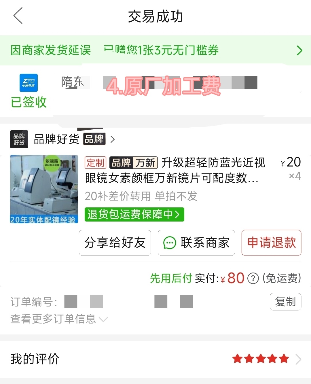 5.加工:我选择的是邮寄加工,先买的镜框,把该镜框发到了配镜商家地址,选择的蔡司原厂加工会稍微贵一点。最后记得让他把镜片的包装随快递发过来。