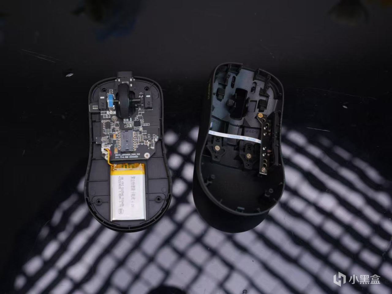 打開鼠標可以看到,這次鴨嘴獸的 PCB 進行了縮小,且放置在前端部分。在多出的後端空間裏讓這個只有46g總量的鼠標裝入一塊500毫安電池。