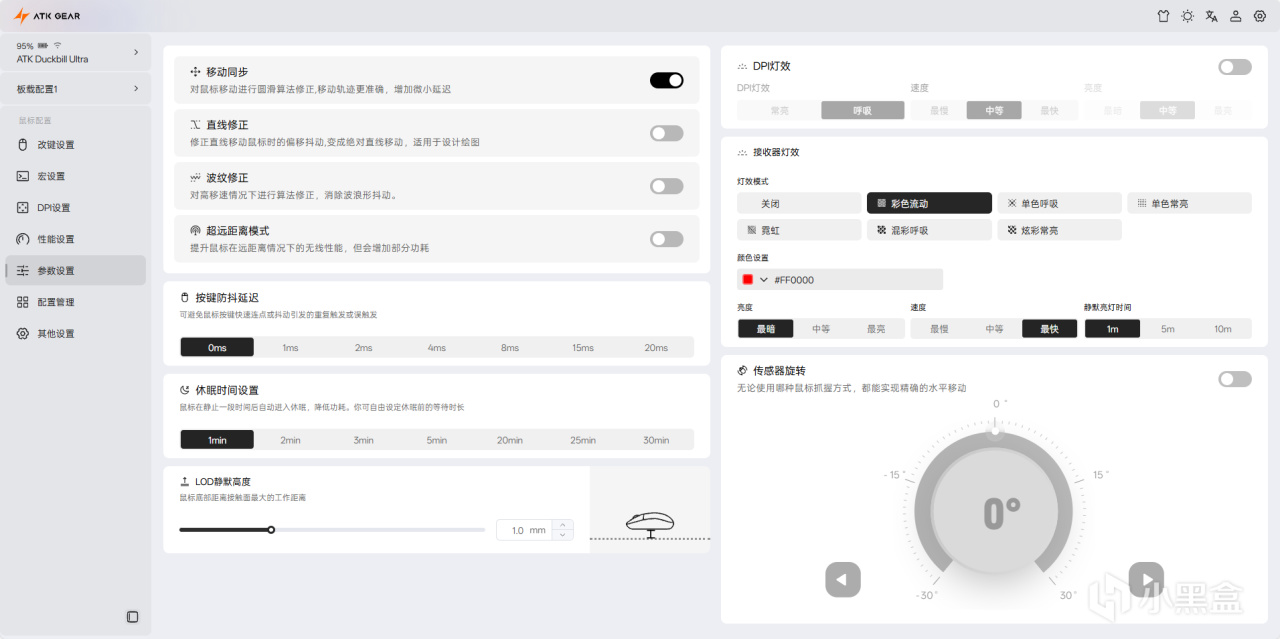 在驅動方面ATK的網頁HUB是這麼多品牌鼠標裏面比較好用的,鼠標在驅動設置裏面無非就是DIP和回報率等就沒啥多說的了。值得一提的是鴨嘴獸也是內置了傳感器旋轉功能,也是就是雷蛇的動態靈敏度,或者說是RAW accel內置。