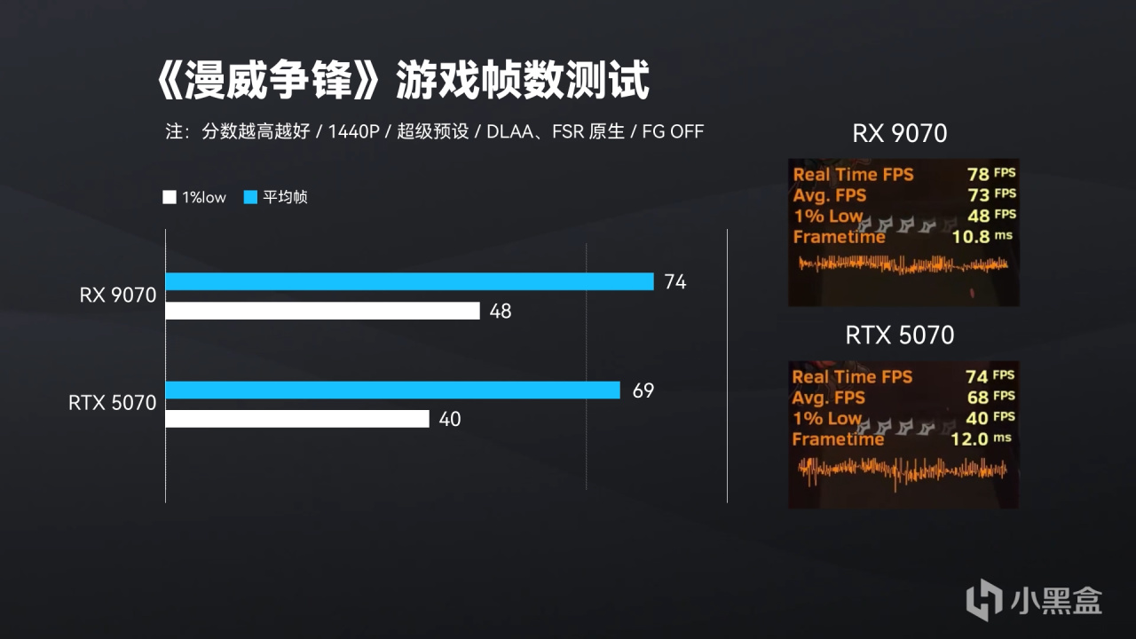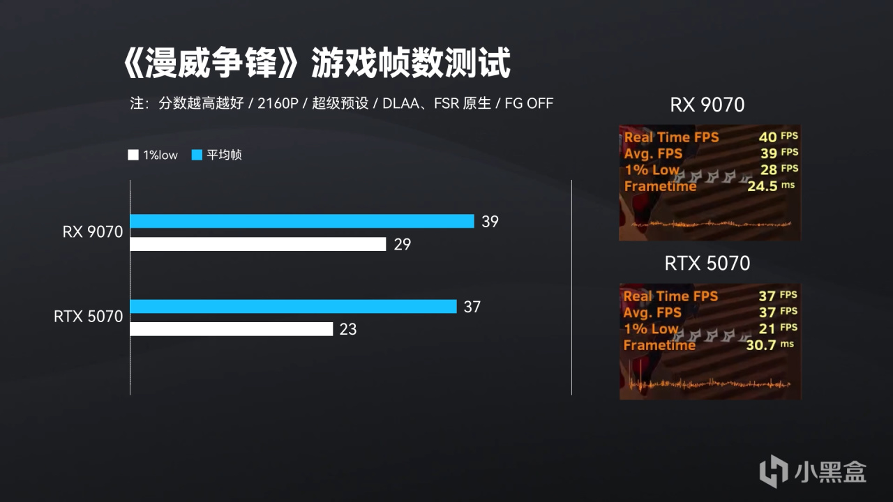 紧接着是Steam在线人数颇高的漫威争锋中,9070继续保持着帧数领先的姿态,平均帧以及1%Low帧要比5070高出约7%和20%。