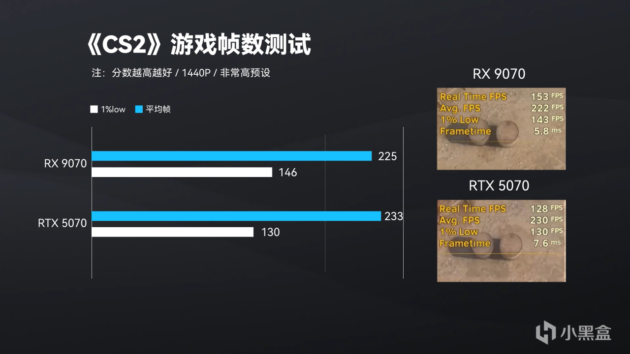 不过当来到了网游CS2之中,帧数结果就截然不同了,5070在平均帧上要强于9070约3.4%左右,但1%Low帧方面却要低上不少,来到12%的差距。