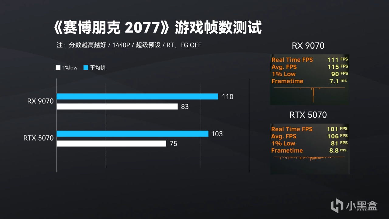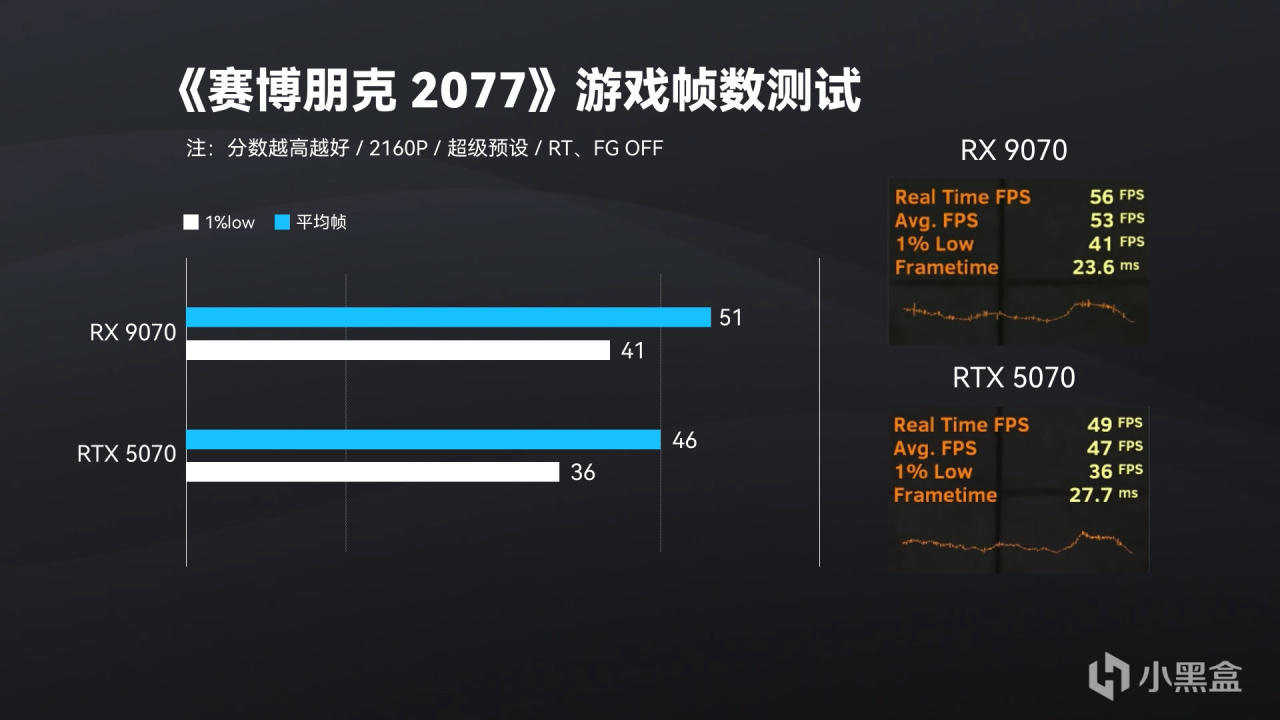 而来到4K分辨率下,帧数就发生了逆转,5070在平均帧上,以2帧的优势击败了9070,但1%Low帧方面,反而是反向降低了2帧,也是有点好笑。