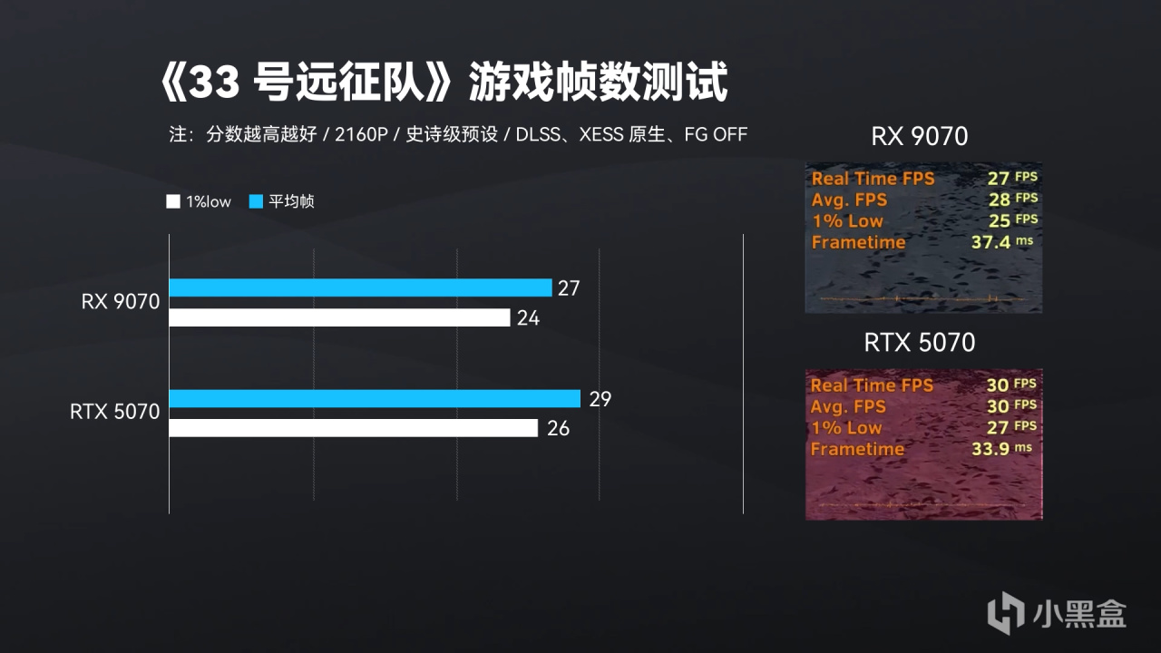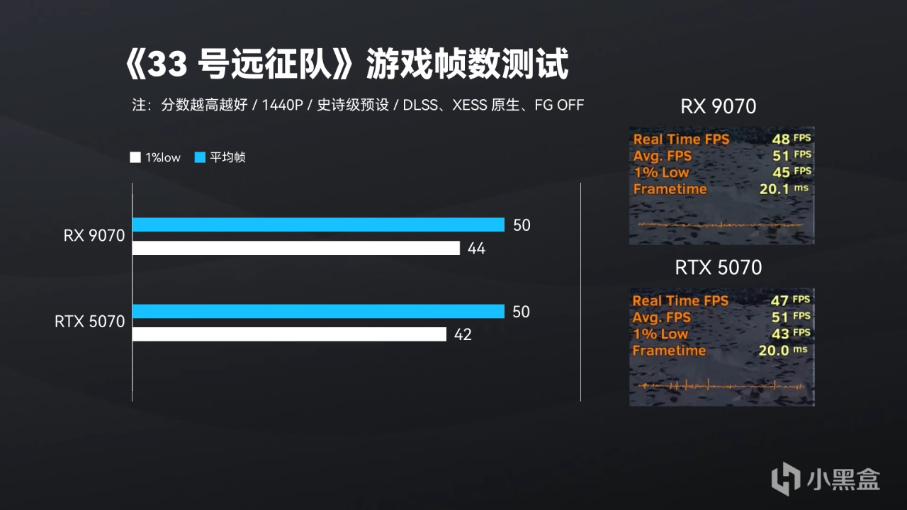 然后是今年刚发布的33号远征队中,2K分辨率下,两张显卡都感受到了前所未有的压力,帧数居然出奇的一致,均是50的平均帧,但是细看之下,9070的1%Low帧会比5070更高5%。