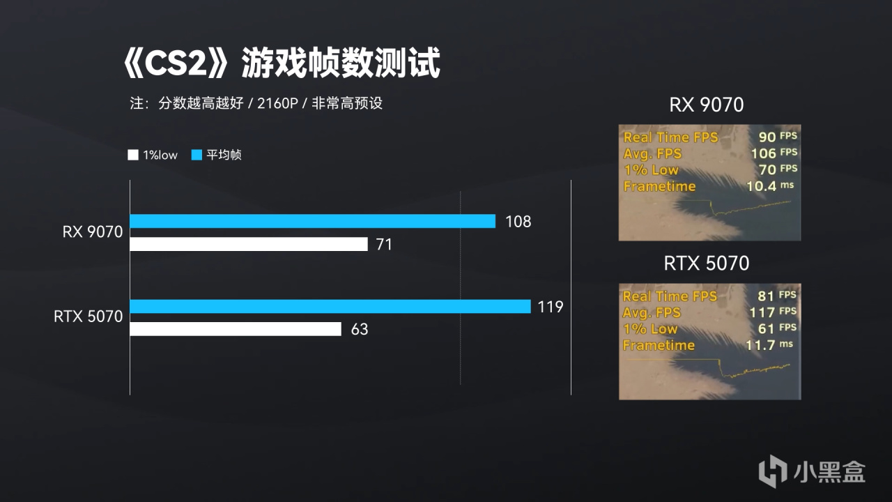 将分辨率提升至4K后,平均帧数的差距进一步拉大,5070性能领先9%,不过同样是1%Low帧方面会相继更低少许多,明明在3A中帧数更高的是9070,怎么到CS2中帧数却要弱上这么多?难道这个游戏真的是A黑?